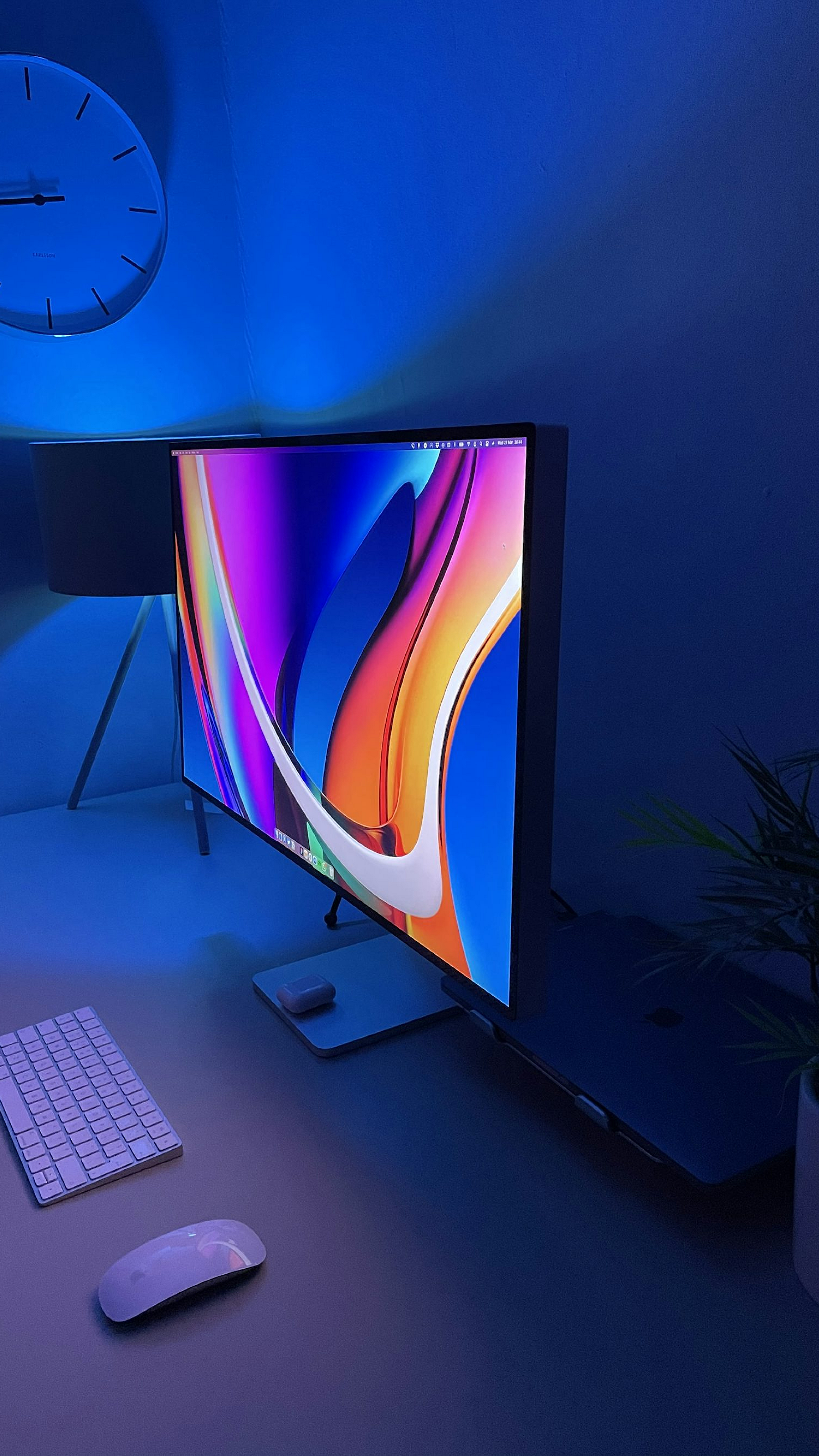 black, flat screen tv, television, turned on, white wall clock, clock, time, minimal, modern, simple, technology, electronics, dark, light, contrast