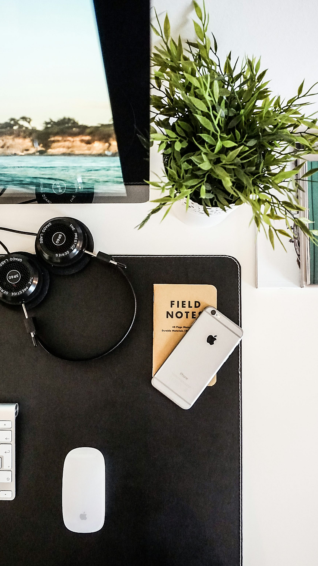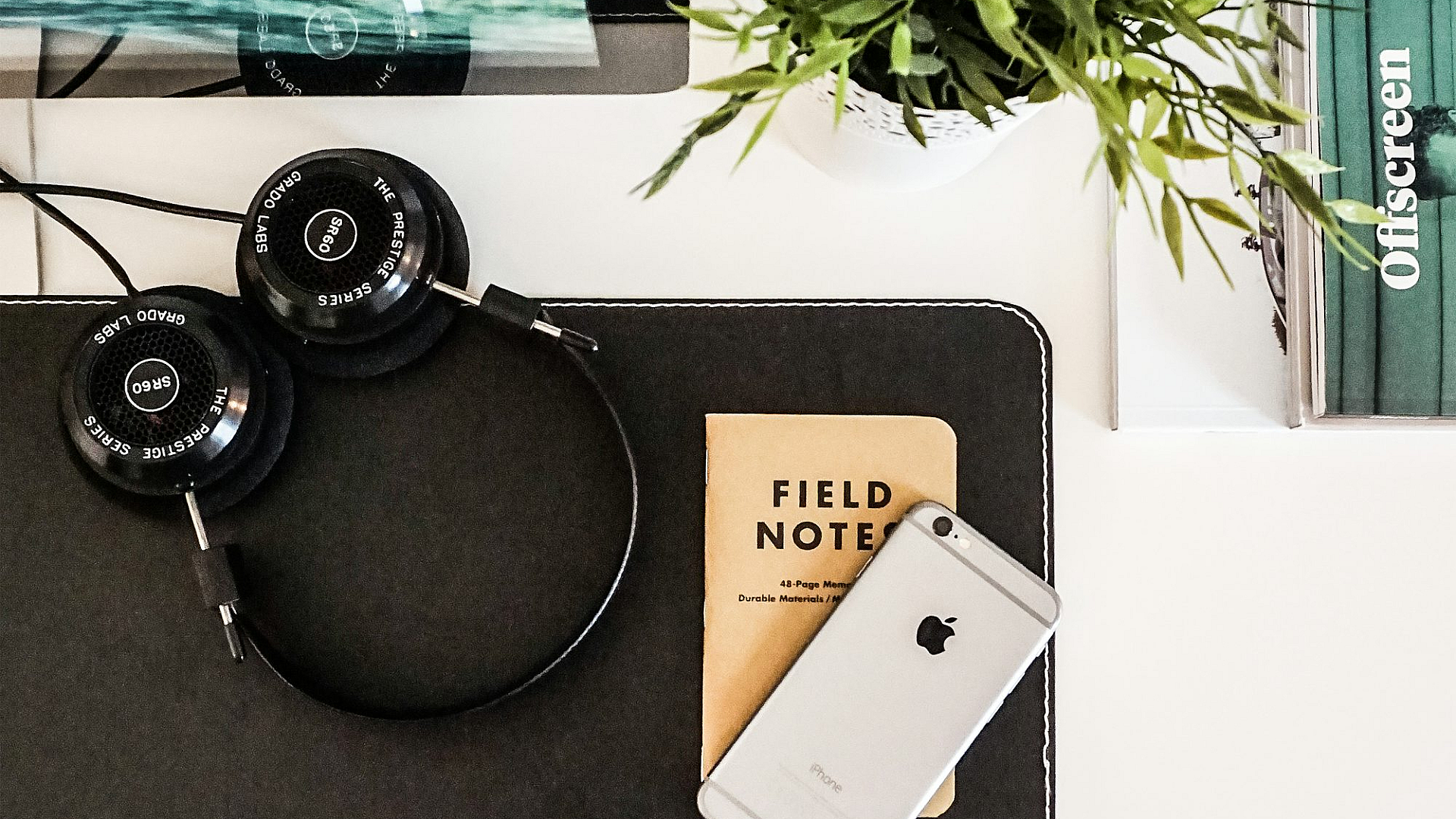 Wallpaper Black Headphones Beside Space Gray iPhone on Brown Table