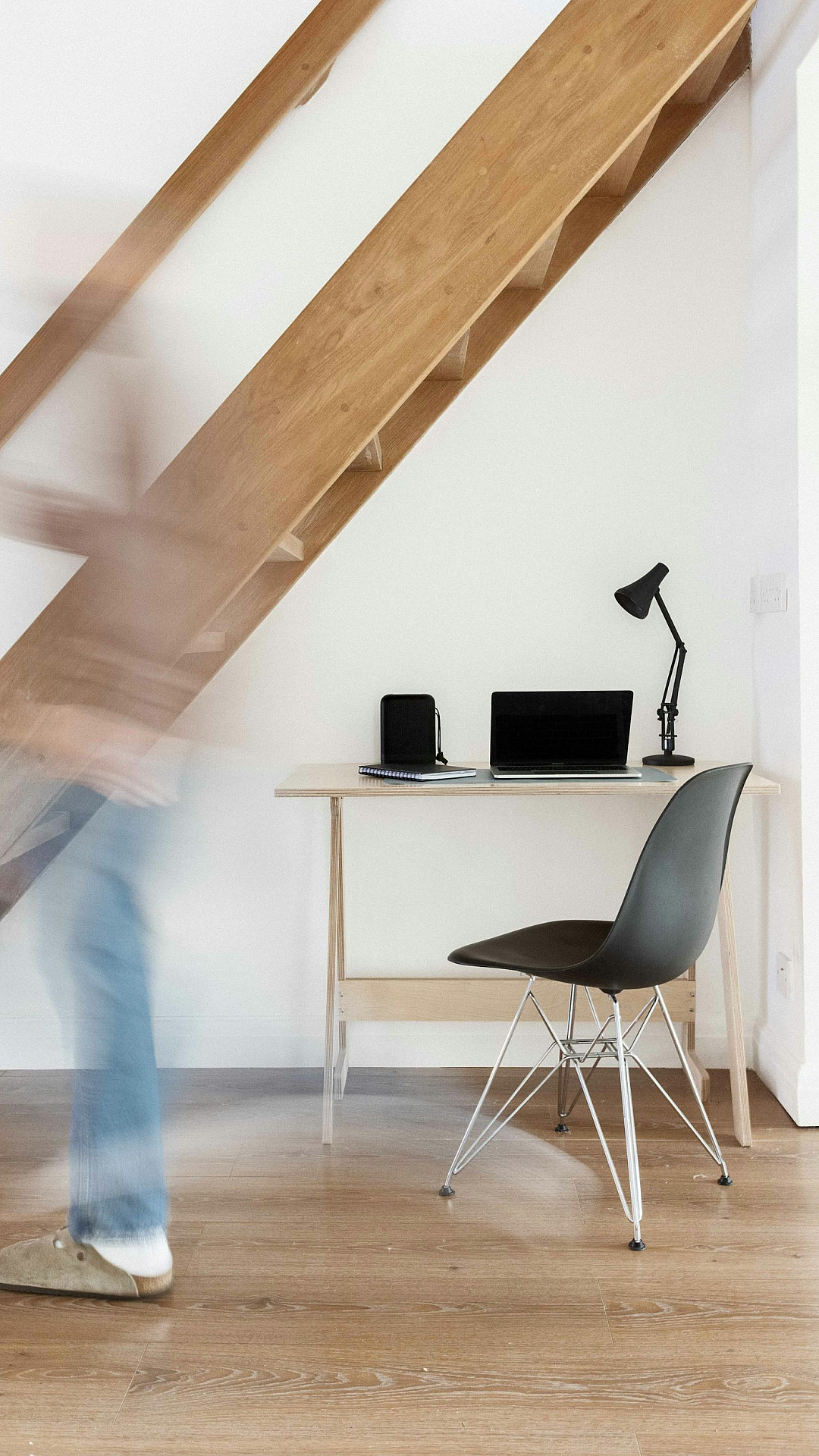 black leather chair, brown wooden table, padded chair, office chair, leather furniture, wooden furniture, desk chair, study chair, vintage chair, retro chair, classic chair, dark chair, wooden desk, home office, interior design