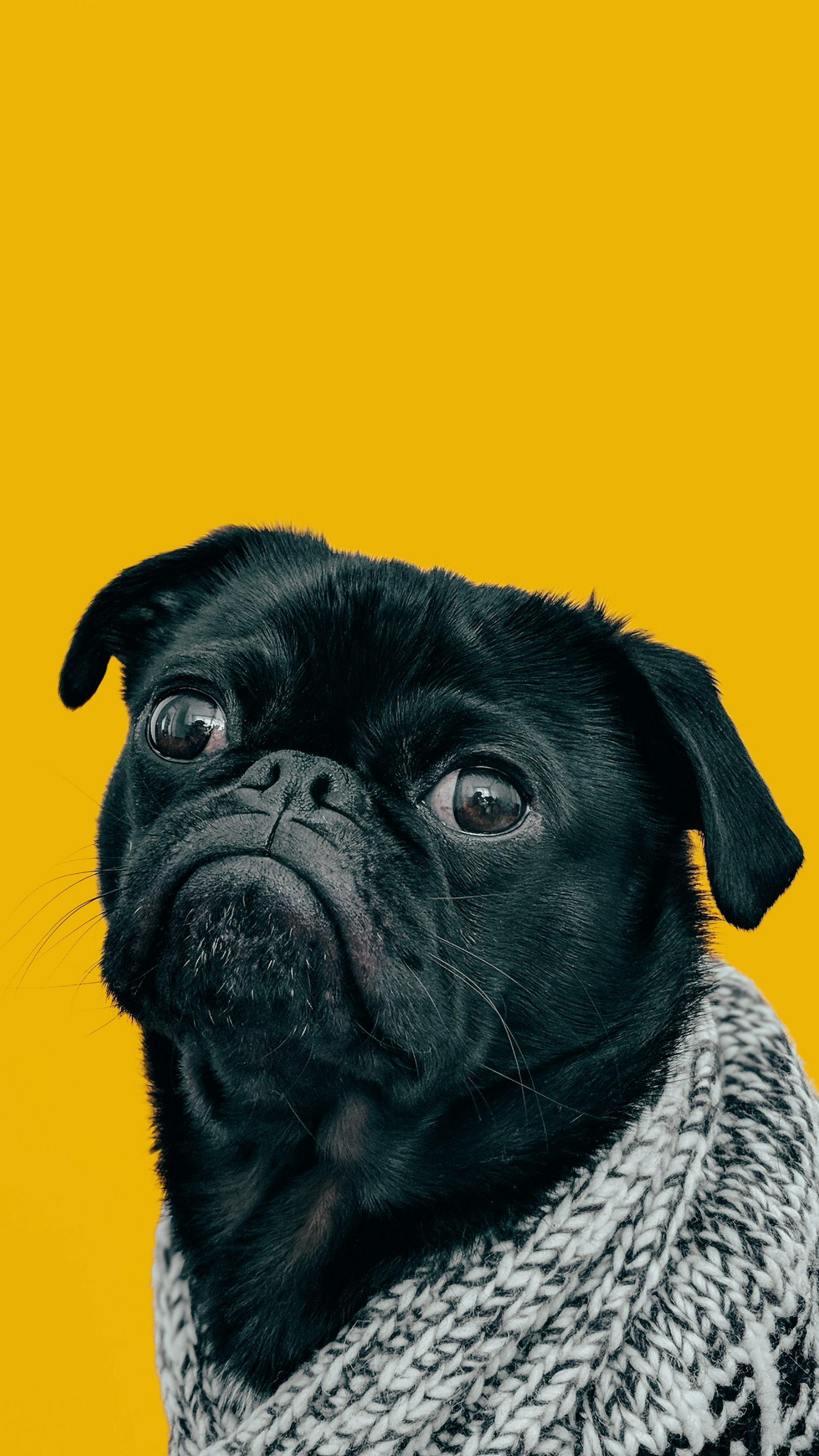 This wallpaper features a black pug wearing a charming gray knit scarf. The image is perfect for adding a touch of warmth and whimsy to your desktop or mobile device. The pug’s adorable expression and the soft texture of the scarf create a cozy and inviting atmosphere.
