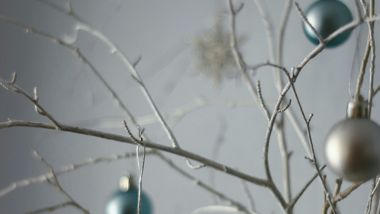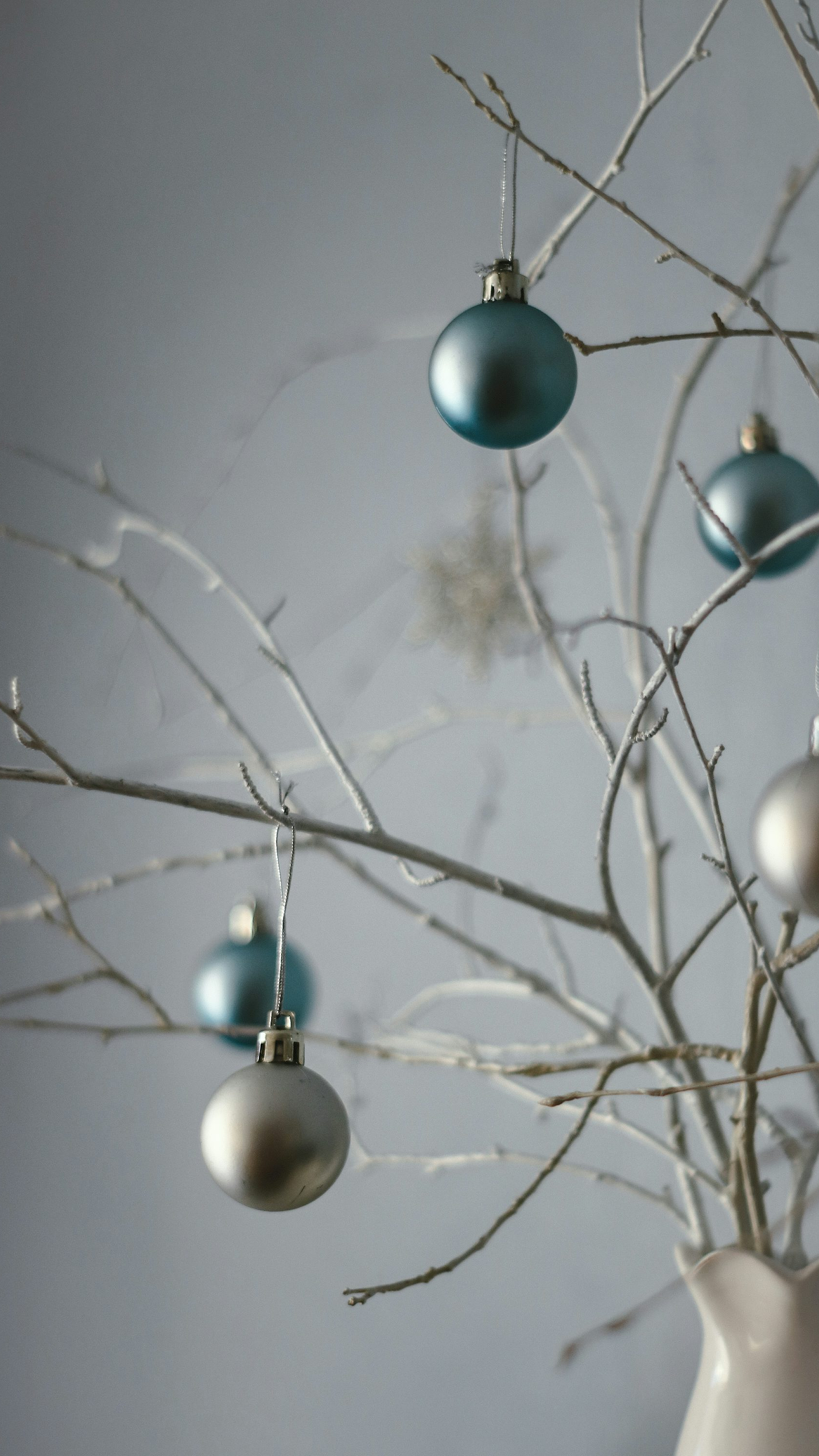 blue baubles, white baubles, Christmas baubles, ornaments, tree branch, winter scene, holiday decor, festive wallpaper, blue and white theme, Christmas wallpaper, winter wallpaper, holiday background, winter decorations, decorative balls, winter wonderland