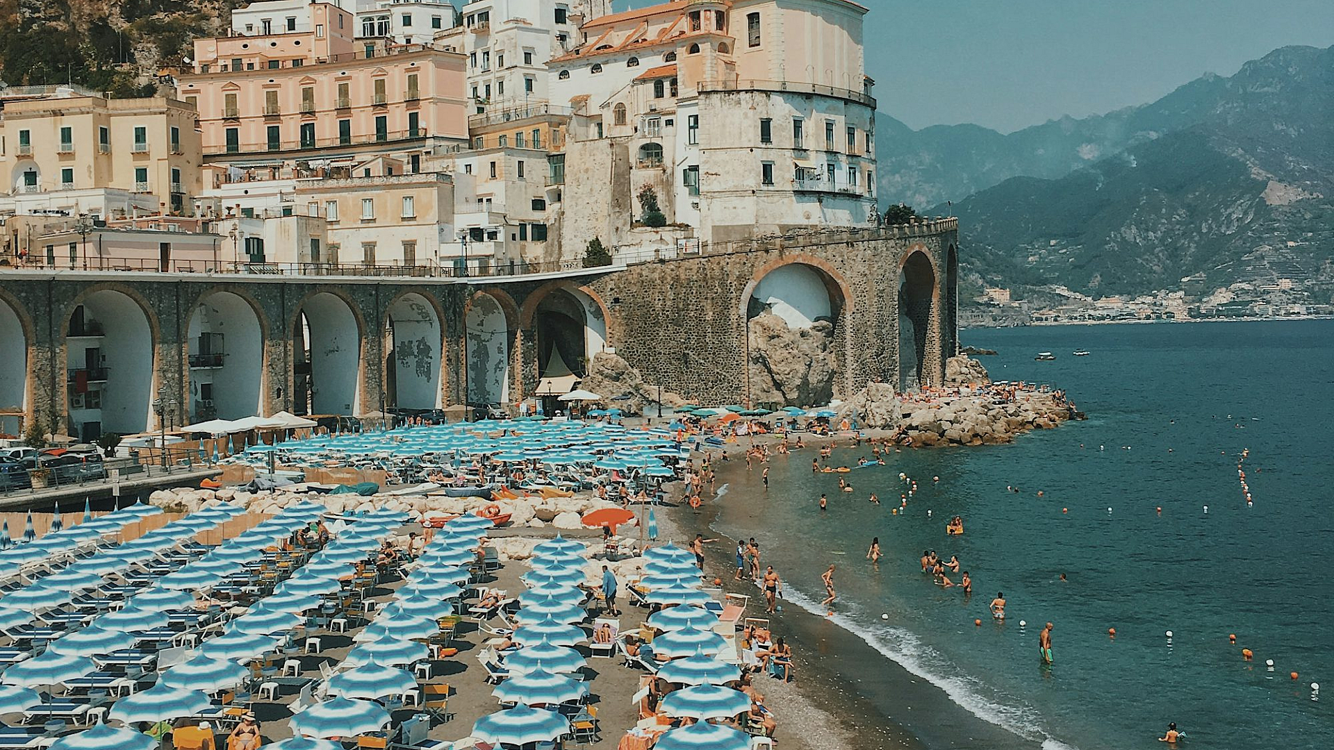 This wallpaper is ideal for use on desktops, laptops, tablets, and smartphones. Its high-resolution quality ensures a crisp and clear image, regardless of screen size. The calming color palette and peaceful scene make it a perfect choice for anyone seeking a tranquil and visually appealing backdrop for their digital devices. The image is perfect for those looking for a summer vacation theme or a general seaside aesthetic. The variety of umbrellas adds visual interest and texture to the image. The juxtaposition of the man-made concrete wall against the natural seashore creates a unique visual dynamic.