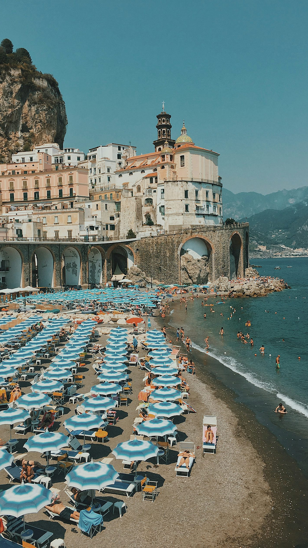 Keywords: blue, white, beach, umbrella, umbrellas, parasol, concrete, wall, seashore, seaside, ocean, sky, clear sky, summer, vacation