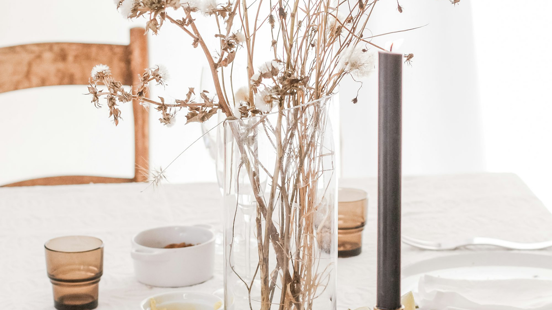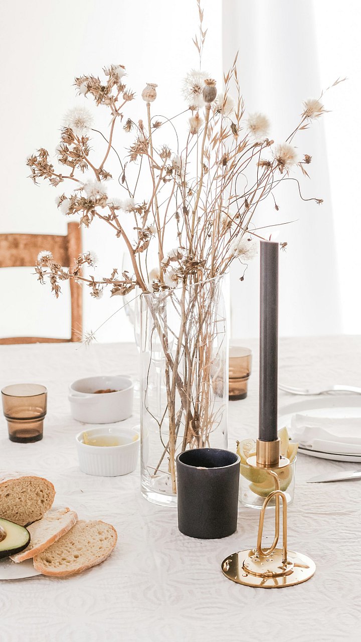 This wallpaper features a still life arrangement of a loaf of bread and a bouquet of flowers artfully placed on a simple table. The image evokes a feeling of rustic charm and vintage elegance.