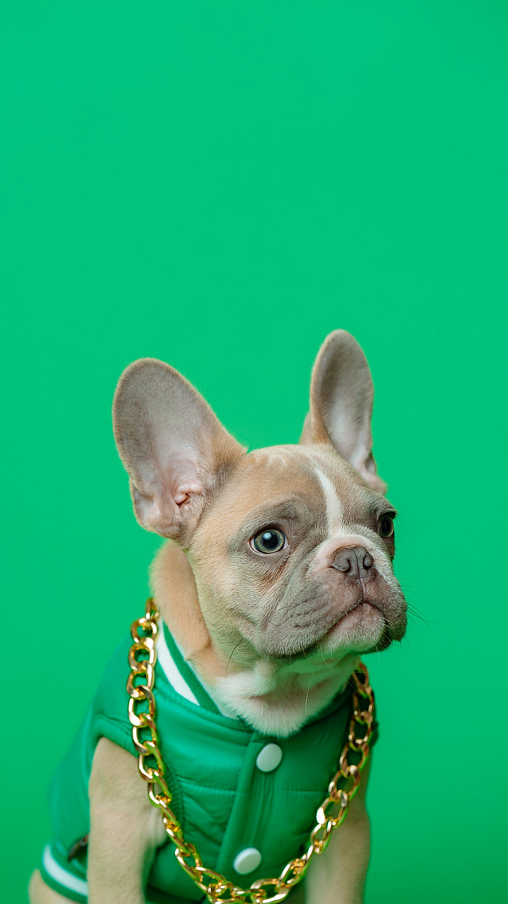 Wallpaper Brown French Bulldog Wearing Blue and White Polka Dot Shirt