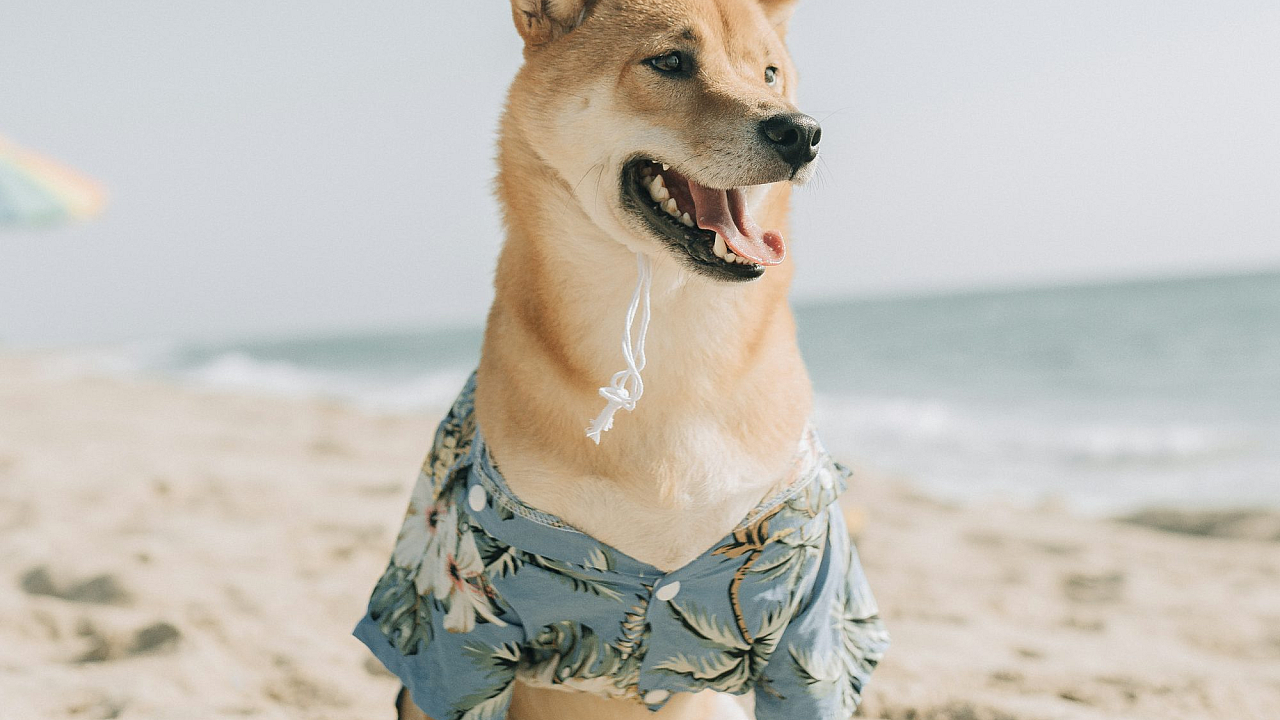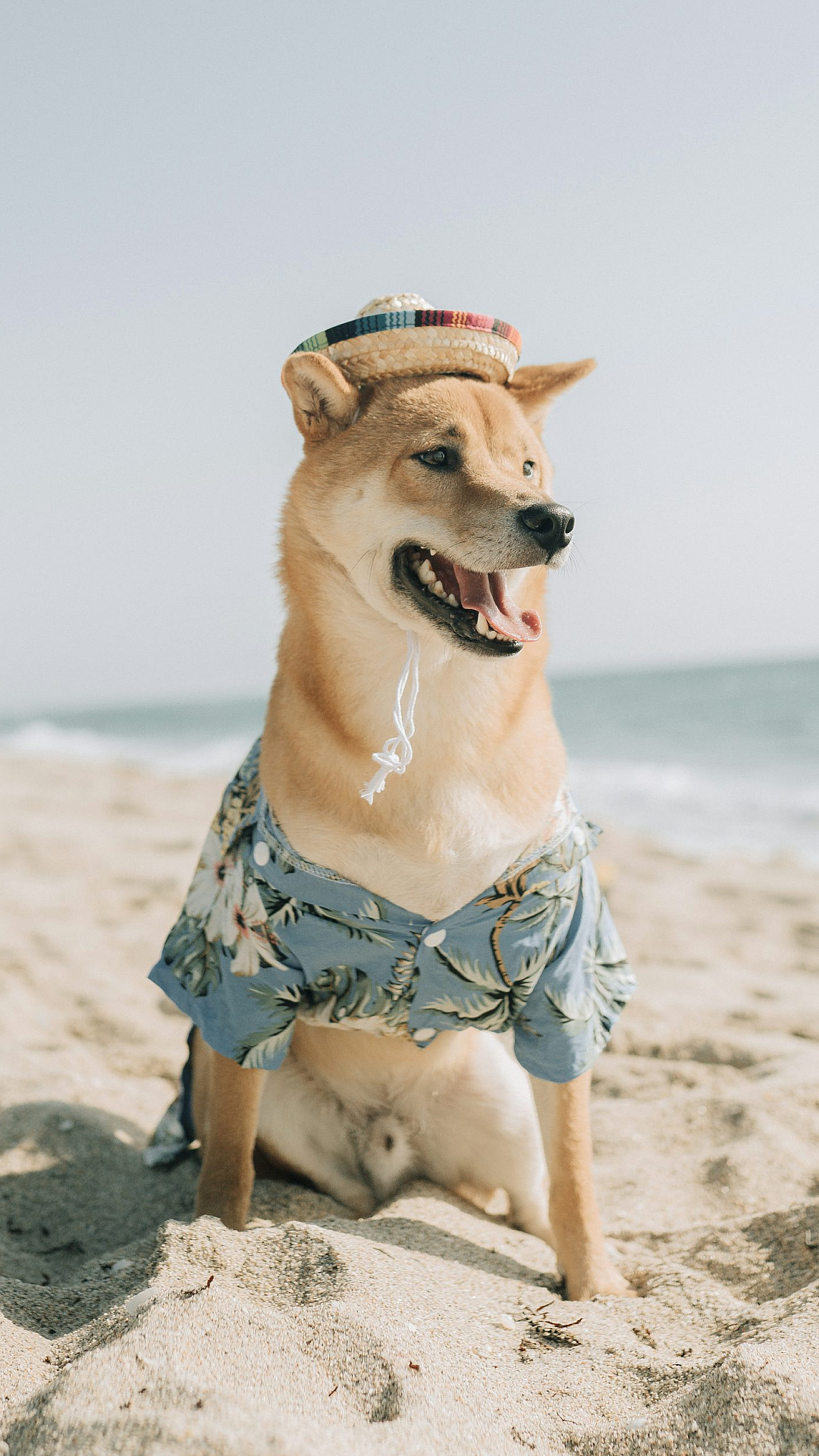 brown dog, short coated dog, polka dot scarf, blue and white scarf, beach, seashore, coastline, sand, dog on beach, dog wallpaper, cute dog, adorable dog, summer, pet, canine