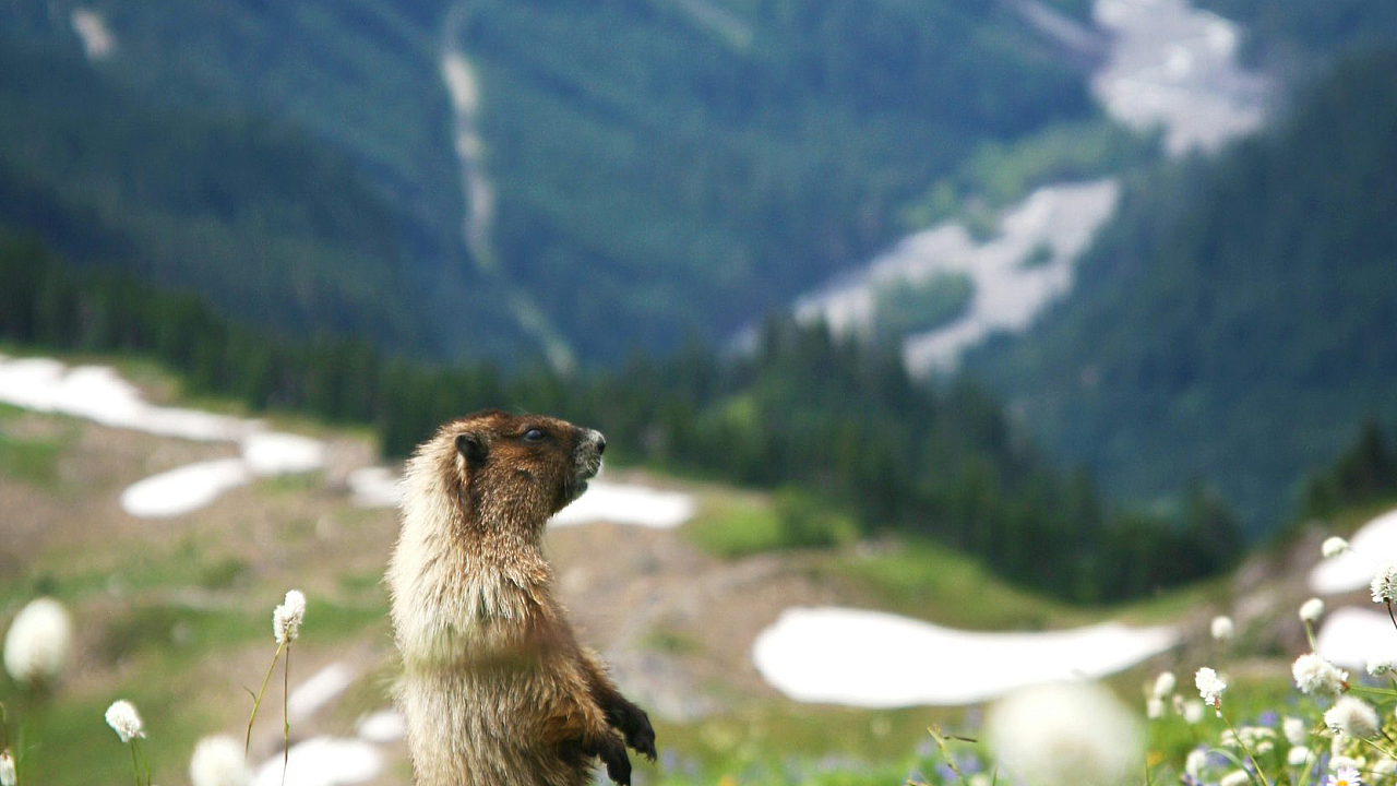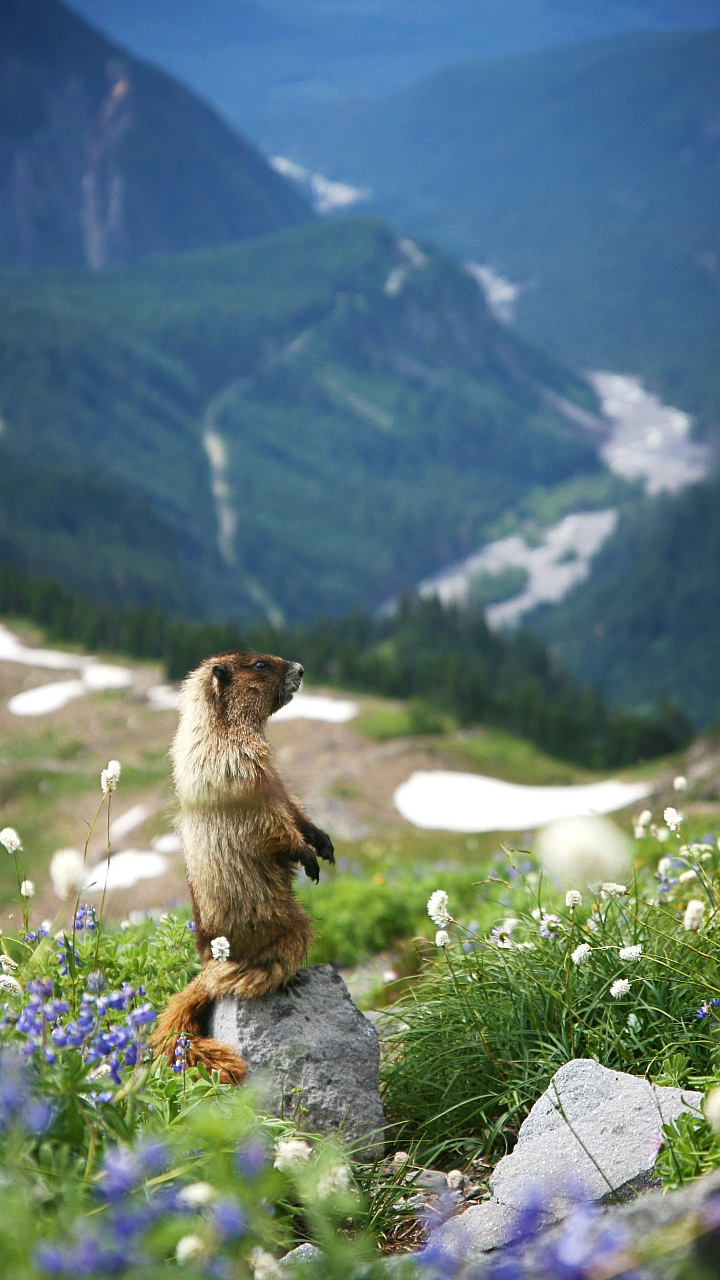 This stunning wallpaper features a brown squirrel standing proudly on a gray stone, surrounded by vibrant flowers. The image is bathed in the warm light of daytime, creating a beautiful and peaceful scene perfect for your desktop or mobile device. The detail is exquisite, capturing the squirrel’s fur and the texture of the stone and flowers perfectly.