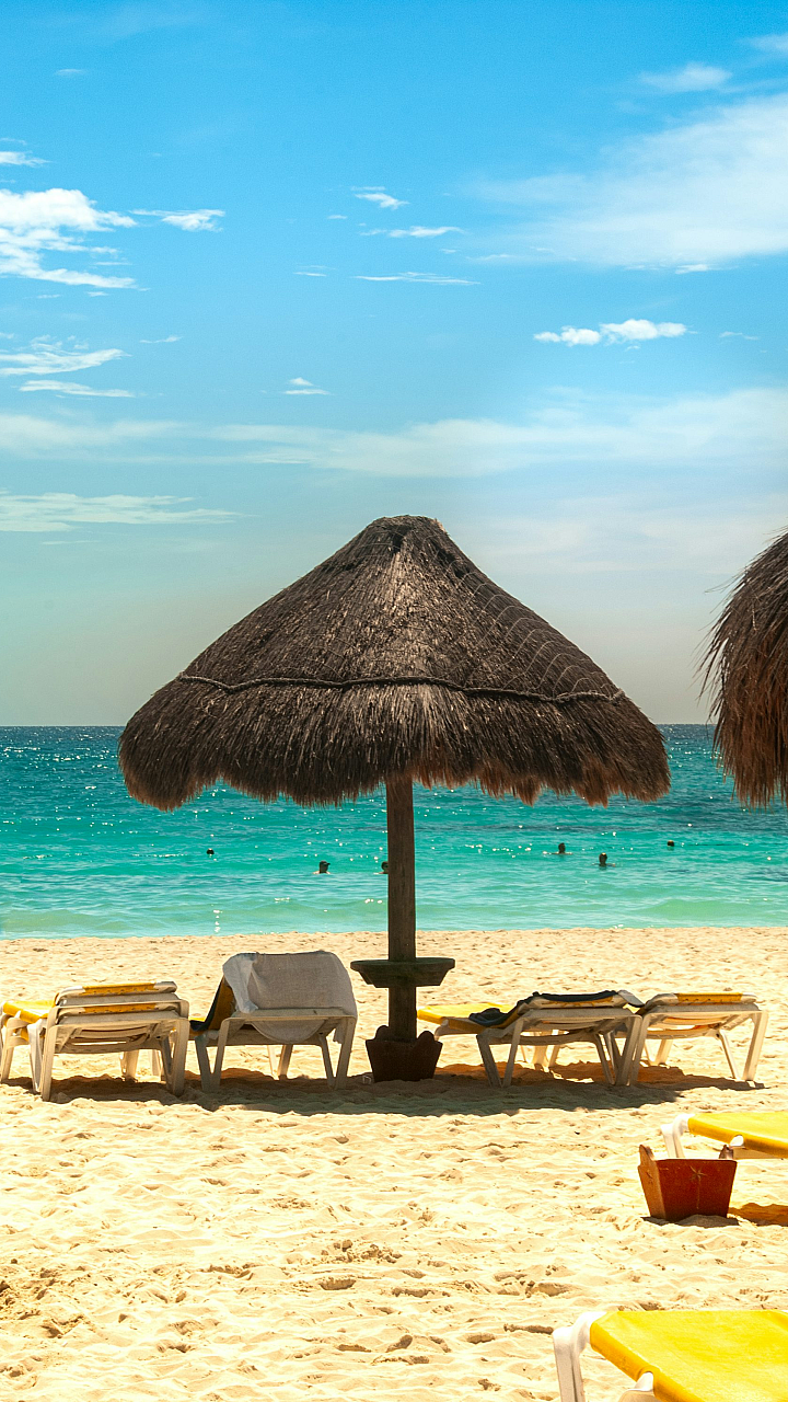 brown wooden beach chairs, beach lounge chairs, wooden beach chairs, beach furniture, seashore, beach shore, coastline, oceanside, daytime, sunny beach, relaxing beach, summer beach, vacation, holiday, tropical beach