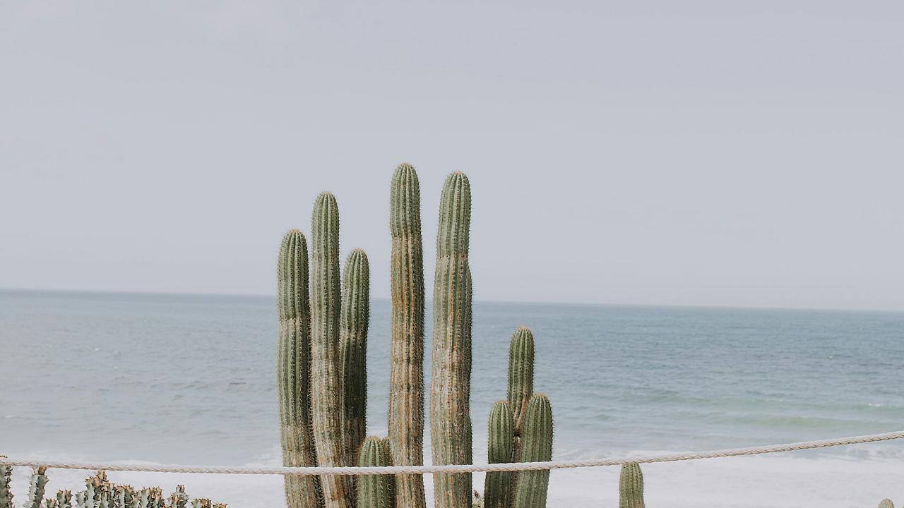cactus, shore, cloudy sky, desert plant, coastal plant, succulent, prickly pear, ocean, sea, beach, clouds, overcast, landscape, nature, scenery