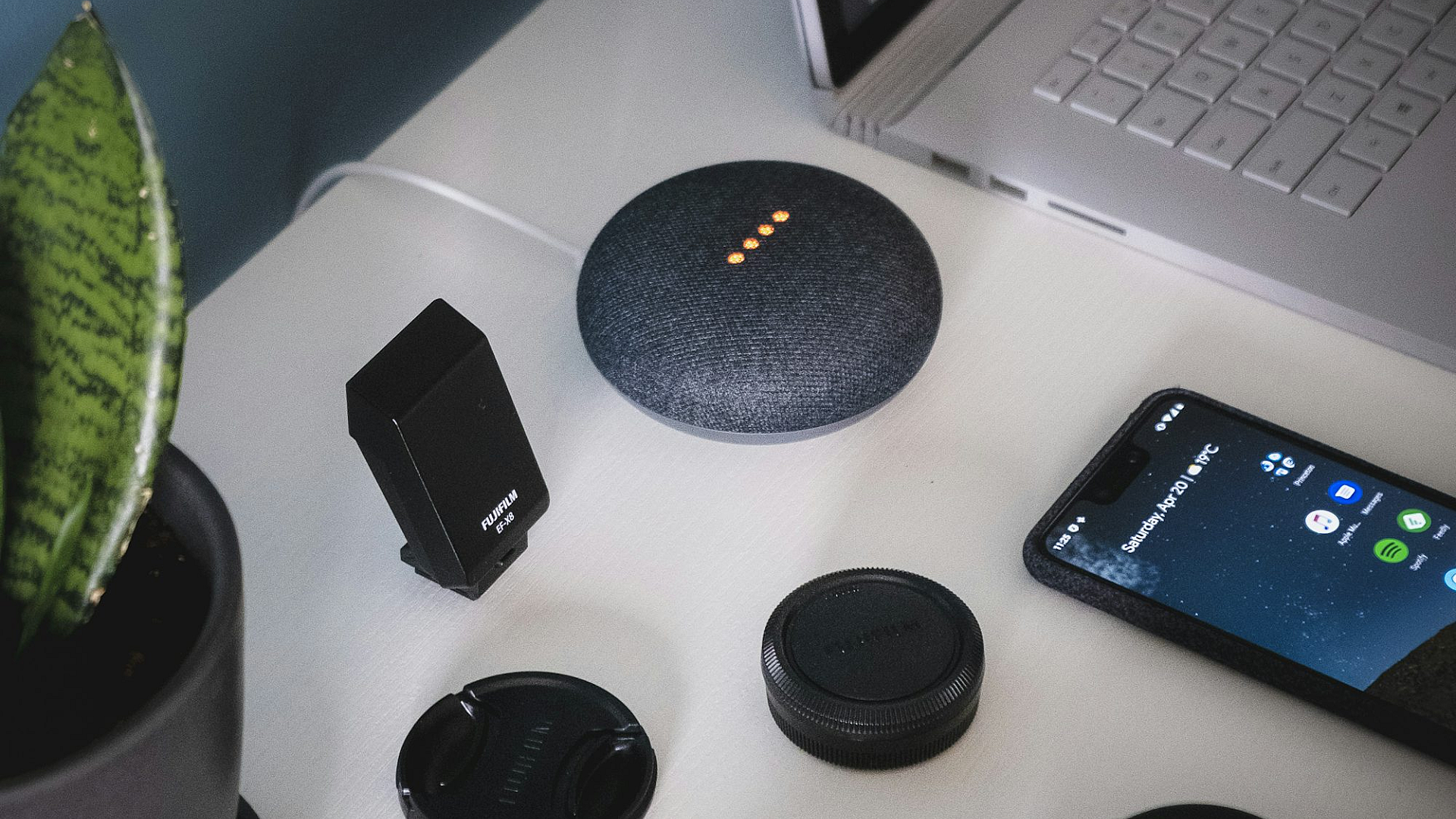 The image evokes a sense of a calm and productive home office or workspace. The inclusion of the Google Home Mini subtly suggests the integration of smart home technology into everyday life. The overall style is both modern and slightly nostalgic, reminiscent of hand-drawn sketches and illustrations.