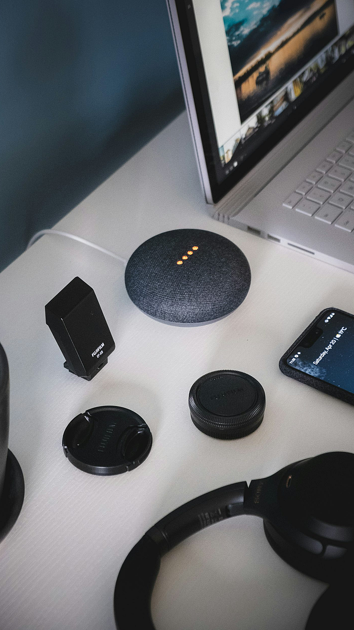 chalk, Google Home Mini, laptop, computer, minimalist, technology, home office, workspace, drawing, sketch, white background, smart home, smart speaker, digital assistant, tech accessories