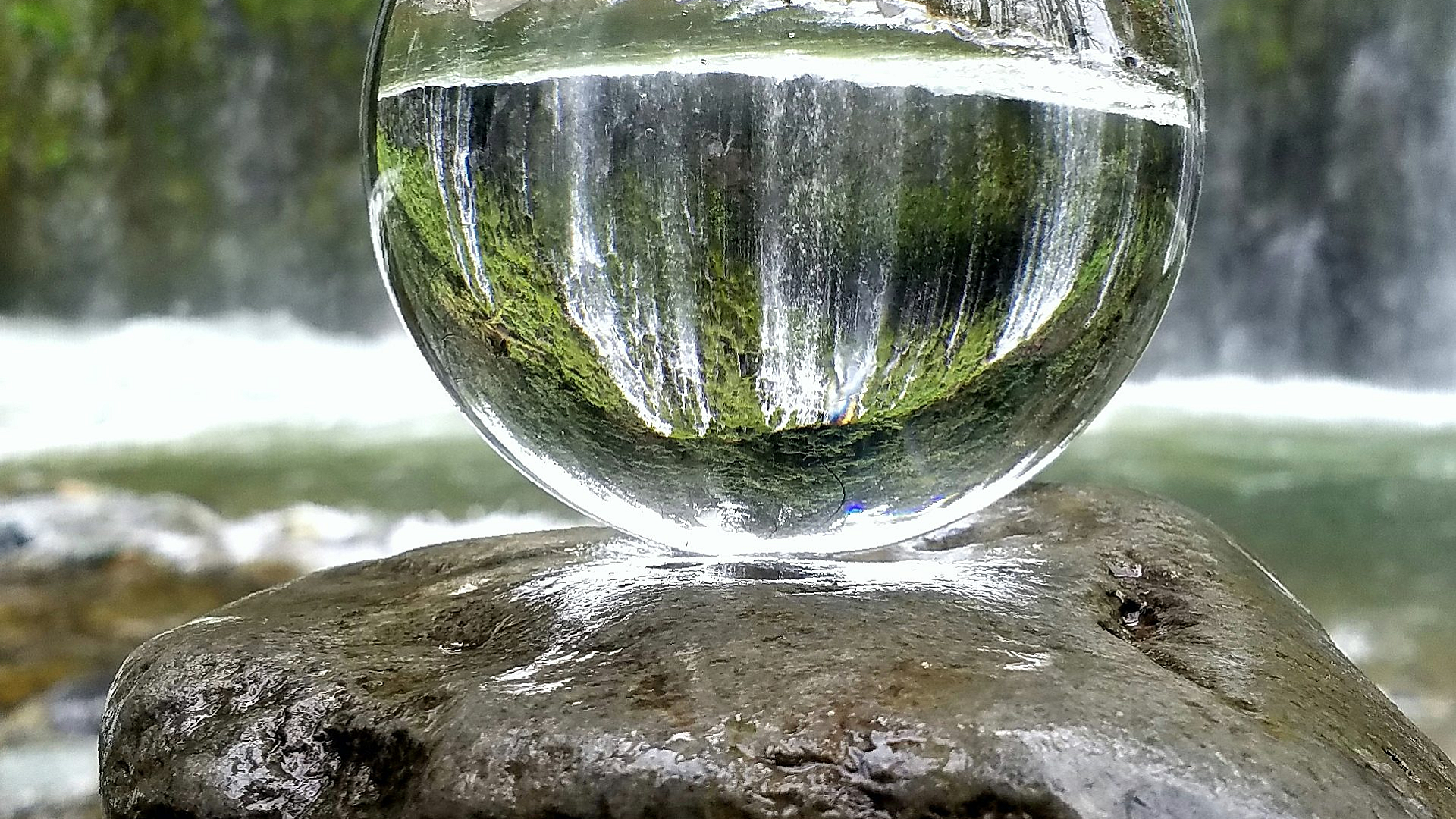 The interplay of light and shadow on the glass ball and the brown rock further enhances the visual appeal, making it a captivating and calming wallpaper choice.