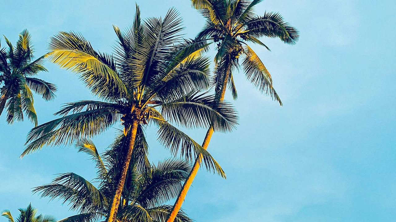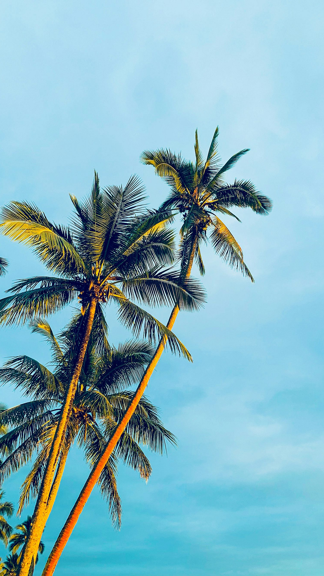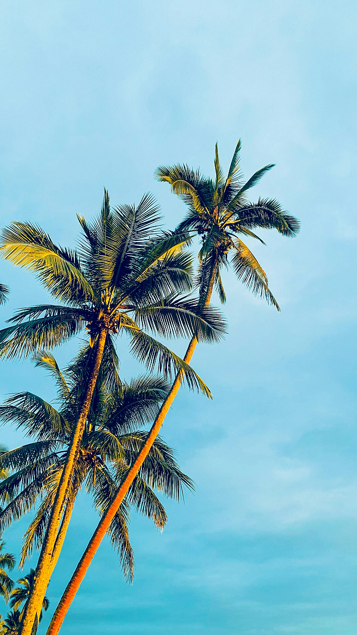 This stunning wallpaper features a vibrant image of coconut trees silhouetted against a brilliant blue sky. The scene is bathed in the warm light of daytime, creating a feeling of tranquil serenity.