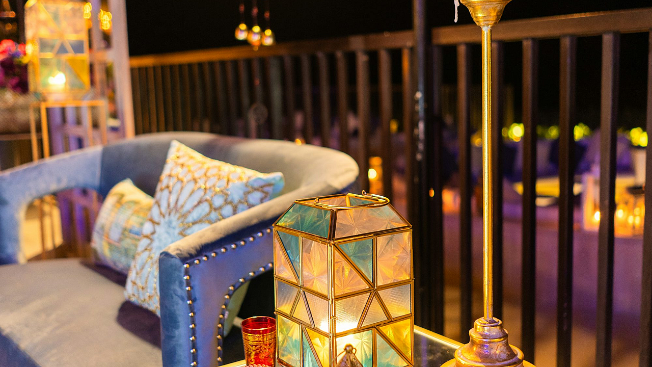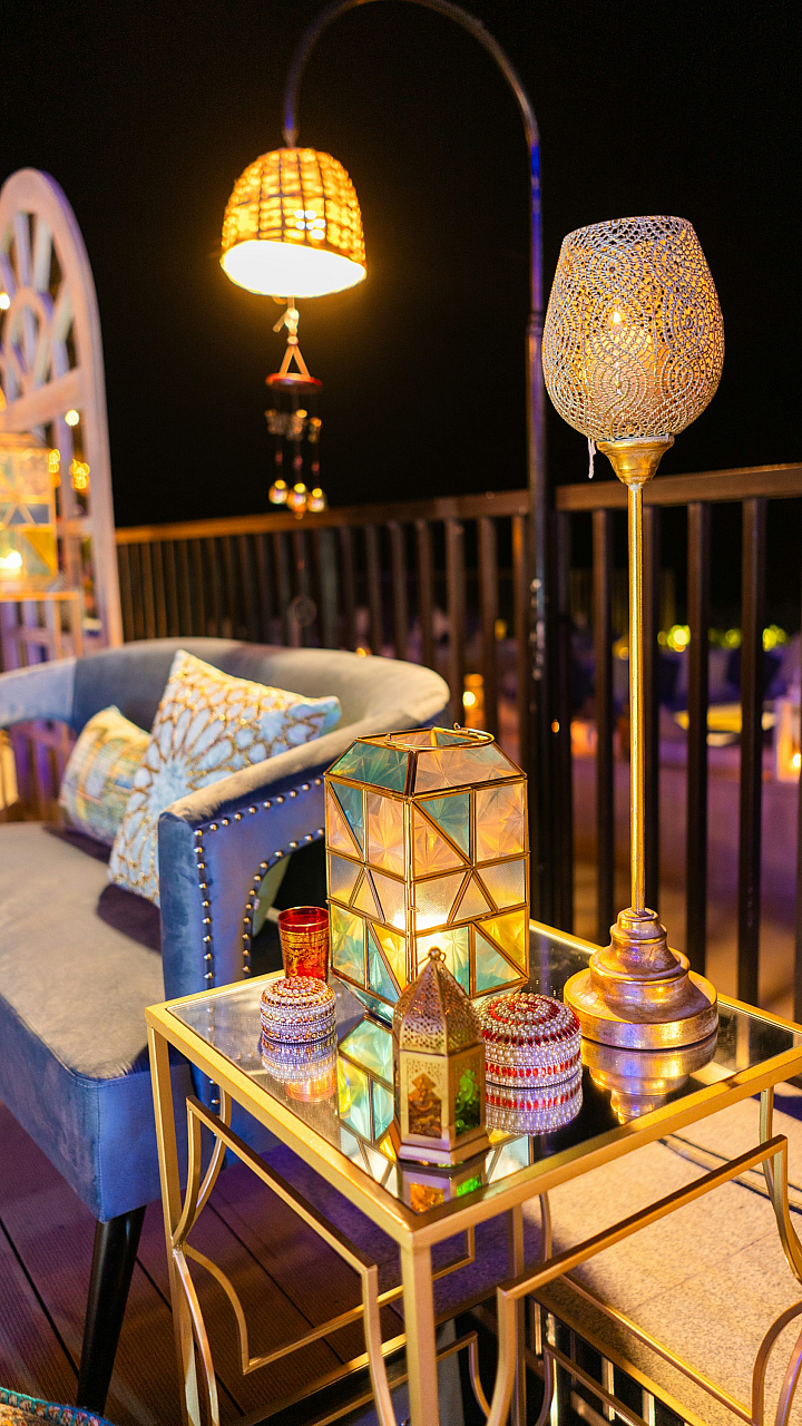 The illumination provided by the lanterns casts a magical spell over the scene, highlighting the intricate details of the decorated area. The warm light creates a welcoming ambiance, inviting the viewer to imagine themselves relaxing in this serene setting. Whether it’s a garden, patio, or other outdoor area, the image captures the essence of a perfectly lit and inviting outdoor space.