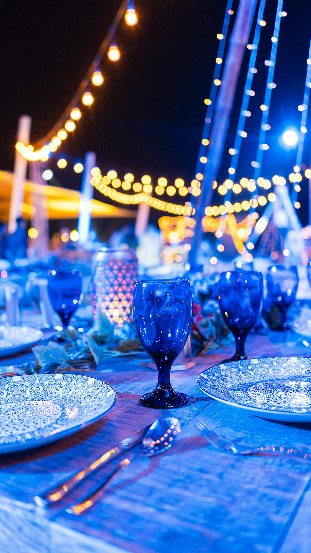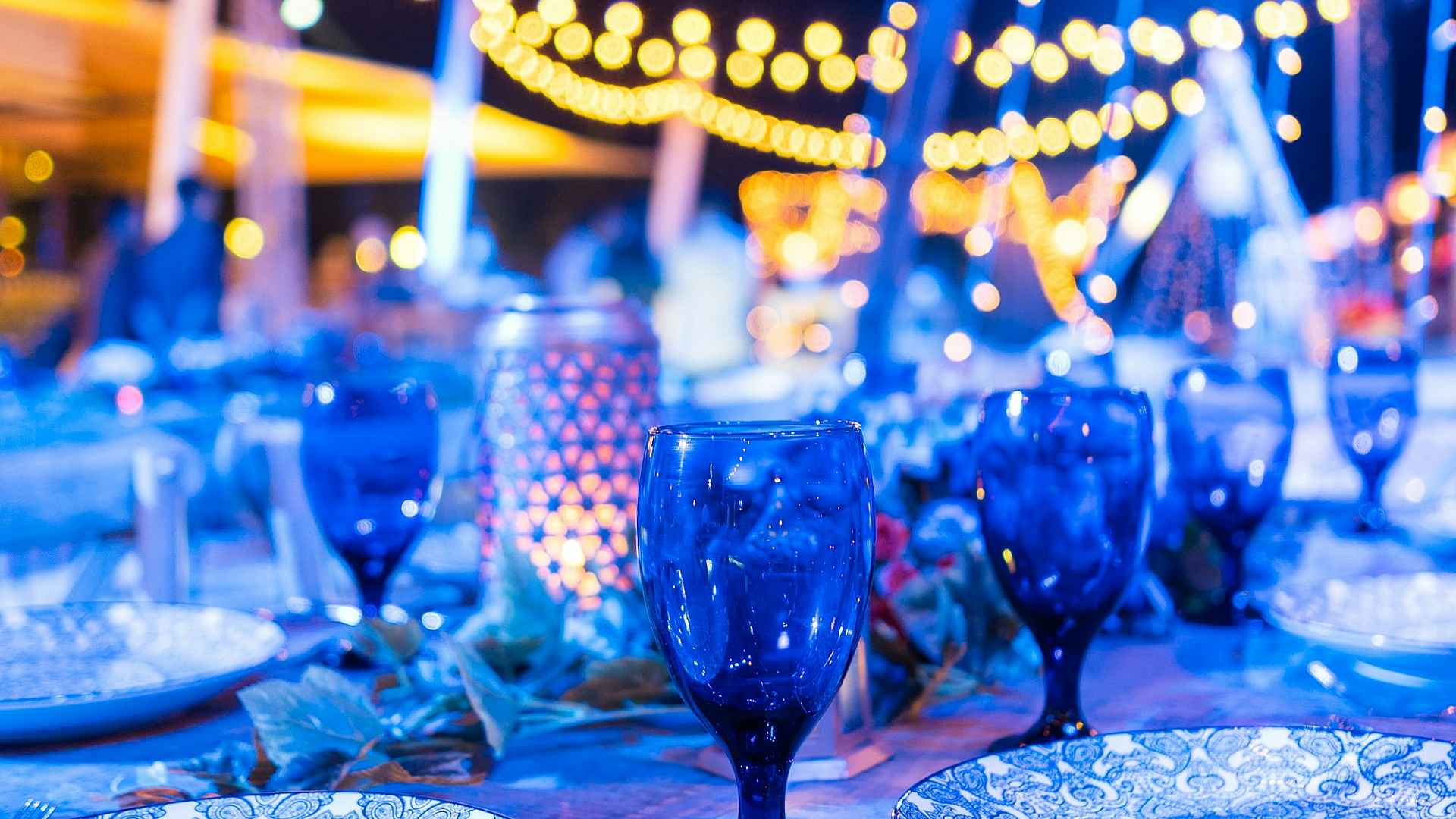 elegant, table setting, blue glassware, night, dinner party, dining, place setting, blue, glassware, dark, evening, sophisticated, refined, stylish, ambiance