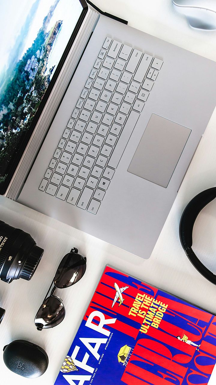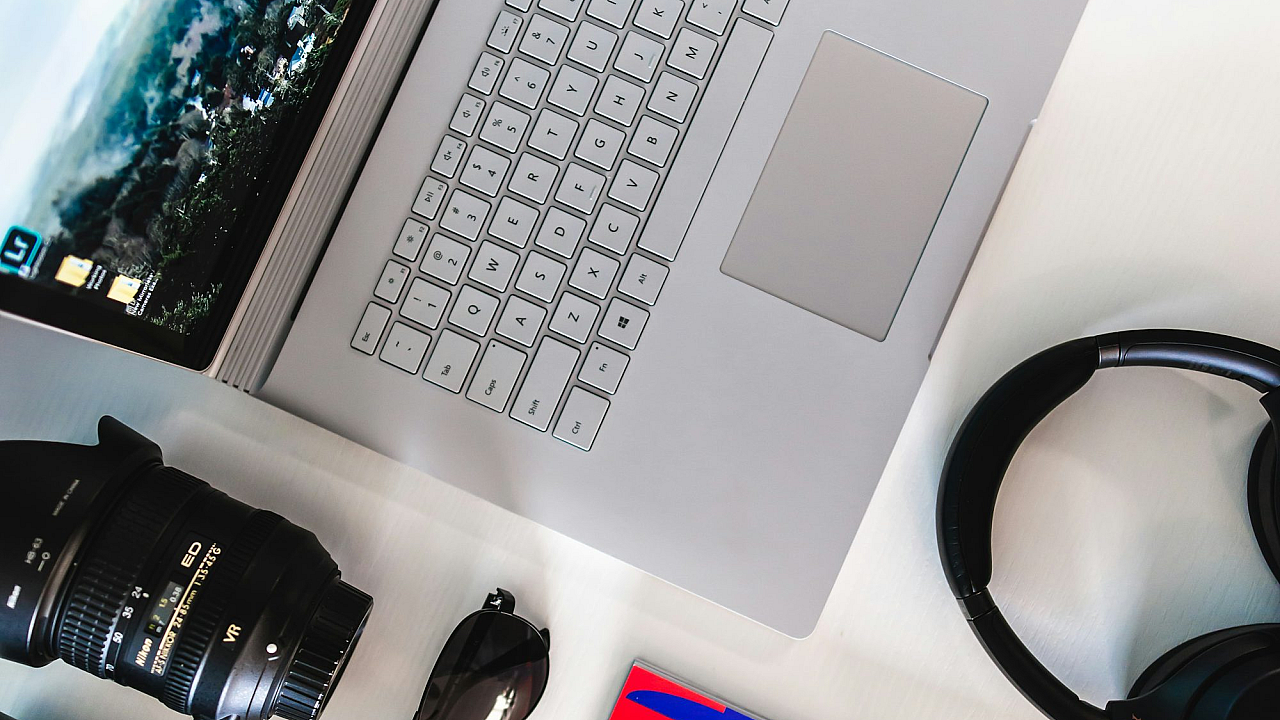 Keywords: flat lay, photography, laptop, headphones, gray, grey, computer, technology, minimalist, simple, overhead shot, top view, workspace, office, aesthetic