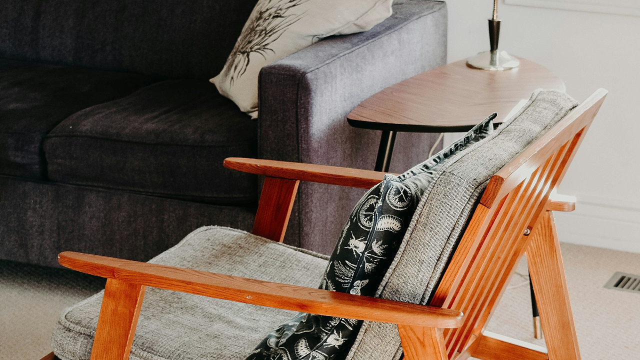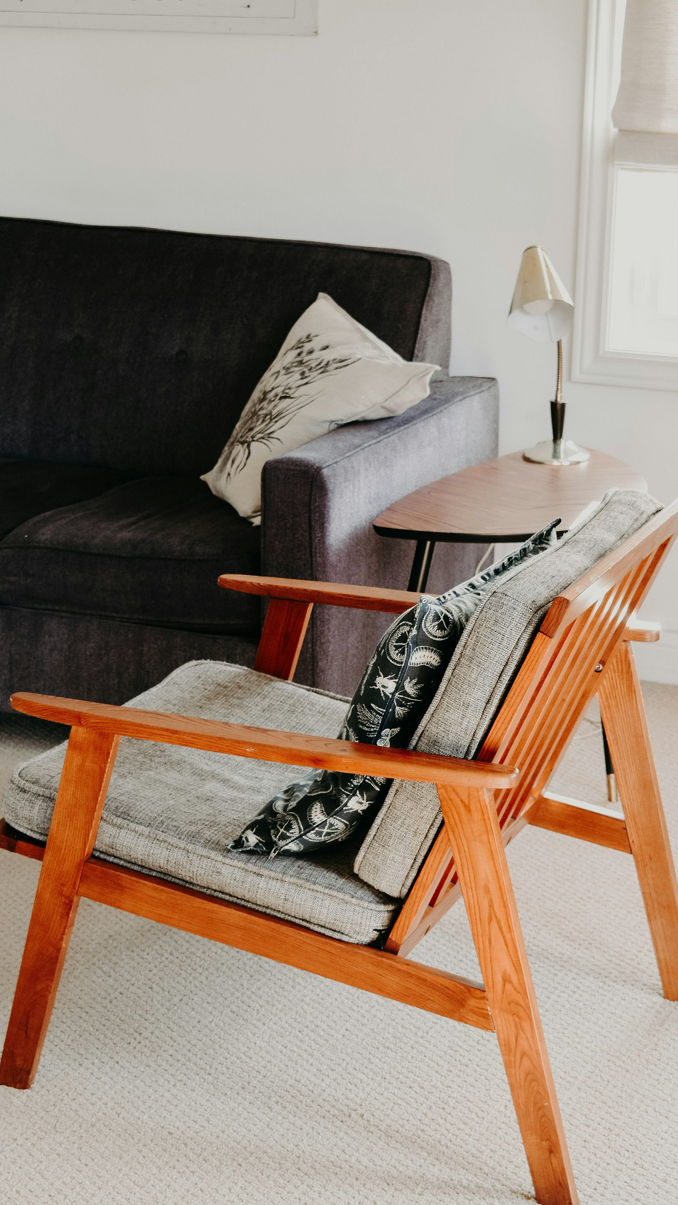 This wallpaper features a gray armchair with a brown wooden frame, sitting elegantly on a beige area rug. The image offers a serene and sophisticated aesthetic, perfect for adding a touch of calm and style to your digital devices. The neutral color palette makes it a versatile choice for various backgrounds.