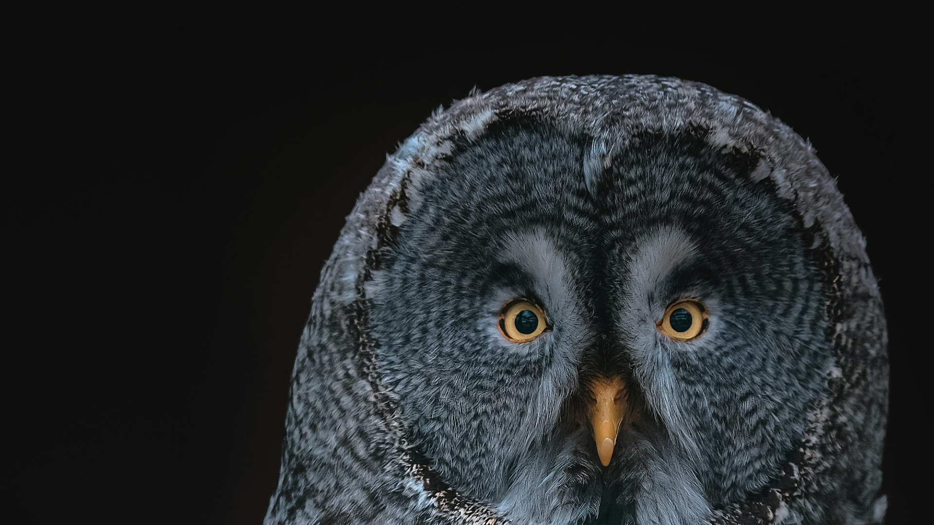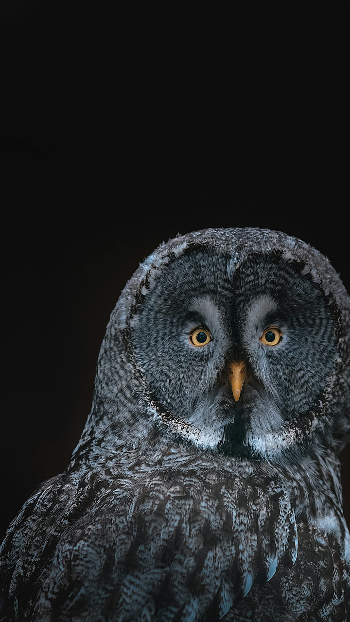 gray owl, black background, owl wallpaper, bird wallpaper, dark wallpaper, night owl, wildlife wallpaper, animal wallpaper, grey owl, strix nebulosa (scientific name), raptors, birds of prey, forest owl, dark bird, monochrome wallpaper
