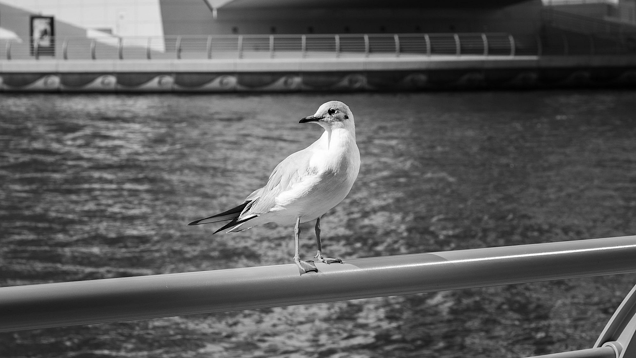 grayscale, bird, railings, monochrome, avian, fence, balustrade, photography, black and white, wildlife, nature, animal, feather, perched, outdoor