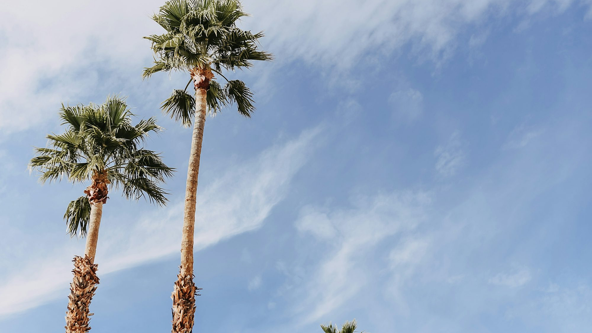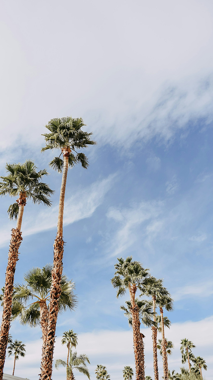 green palm tree, brown palm tree, white clouds, tropical wallpaper, palm tree wallpaper, nature wallpaper, landscape wallpaper, summer wallpaper, beach wallpaper, ocean wallpaper, sky wallpaper, green leaves, brown trunk, tropical scene, paradise wallpaper