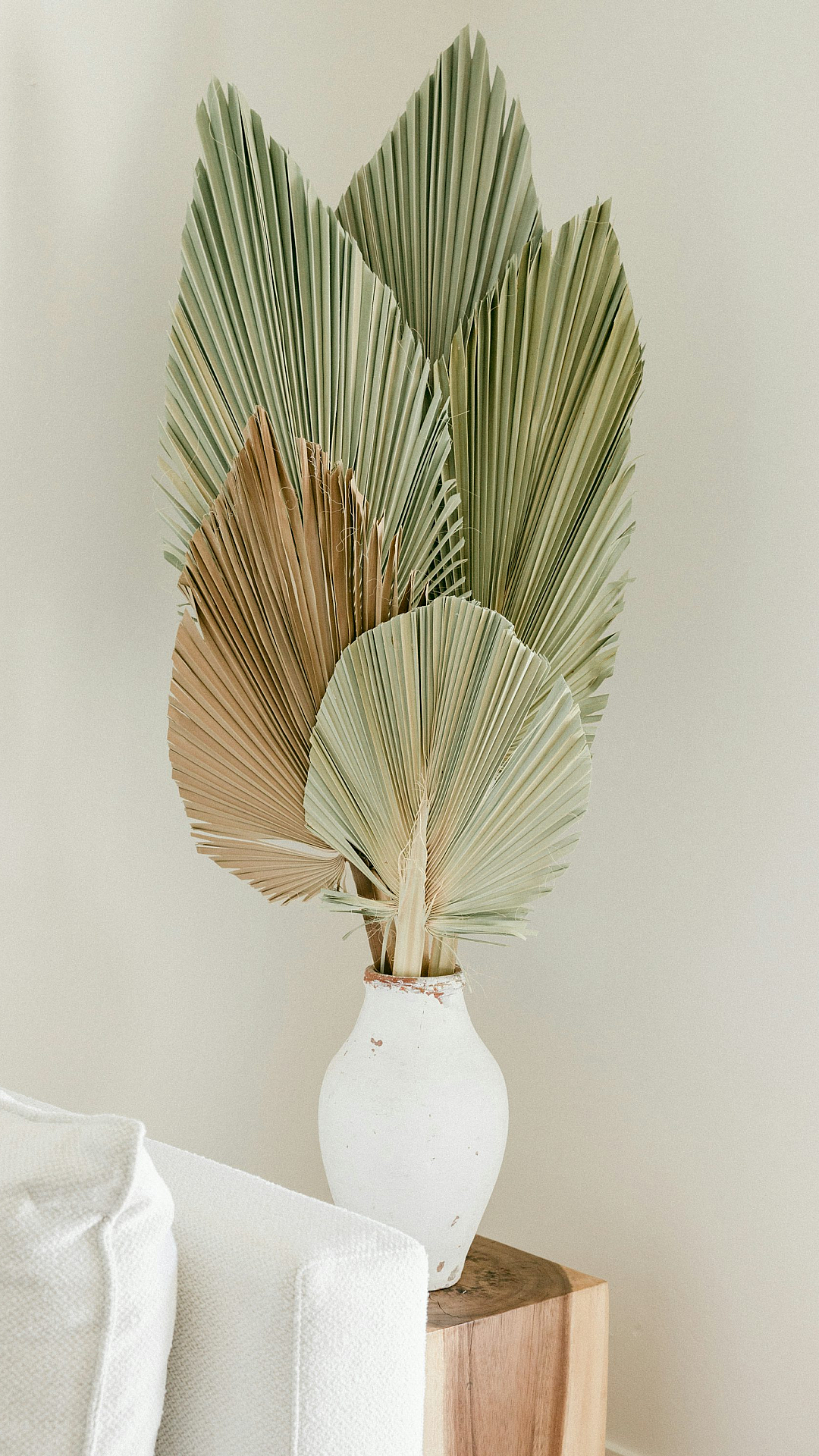 Keywords: green plant, brown plant, white vase, ceramic vase, plant wallpaper, nature wallpaper, botanical wallpaper, home decor, interior design, minimalist wallpaper, simple wallpaper, green and brown, plant photography, houseplant, foliage