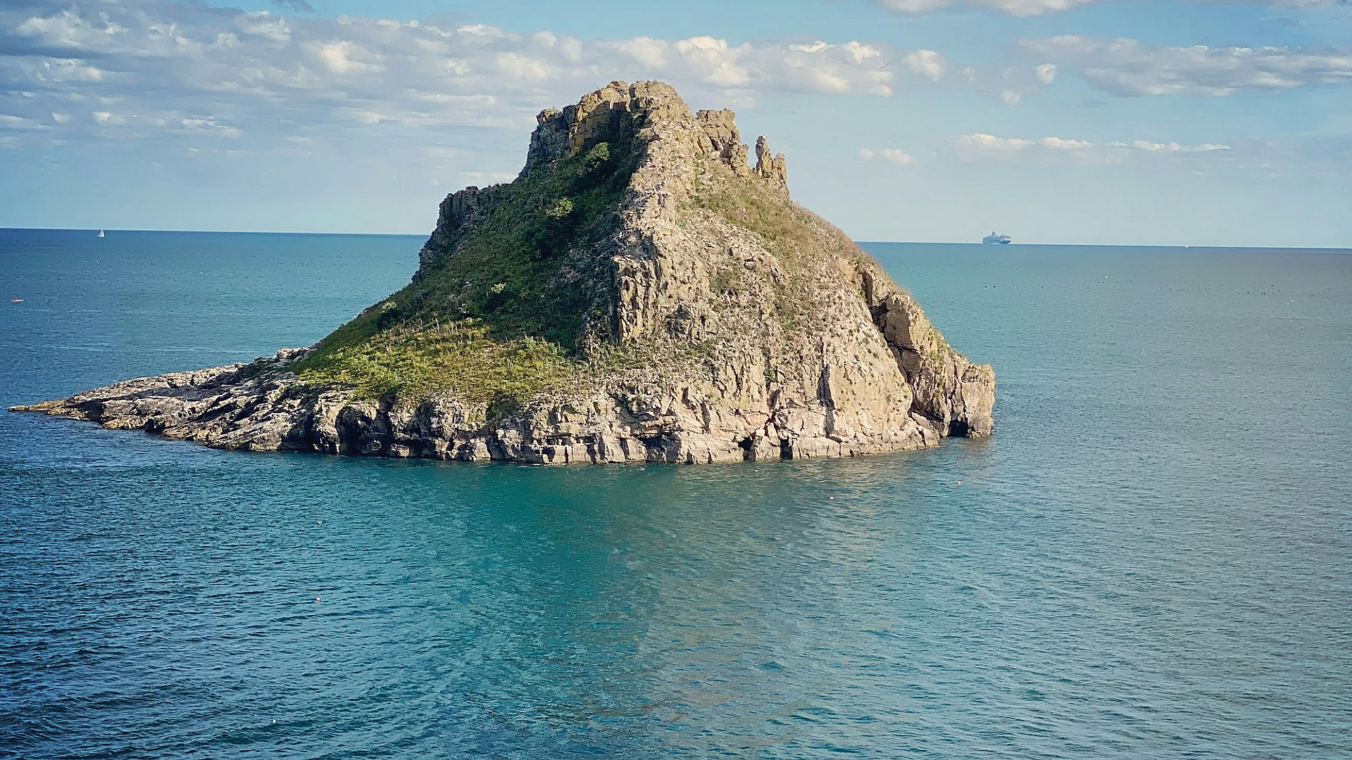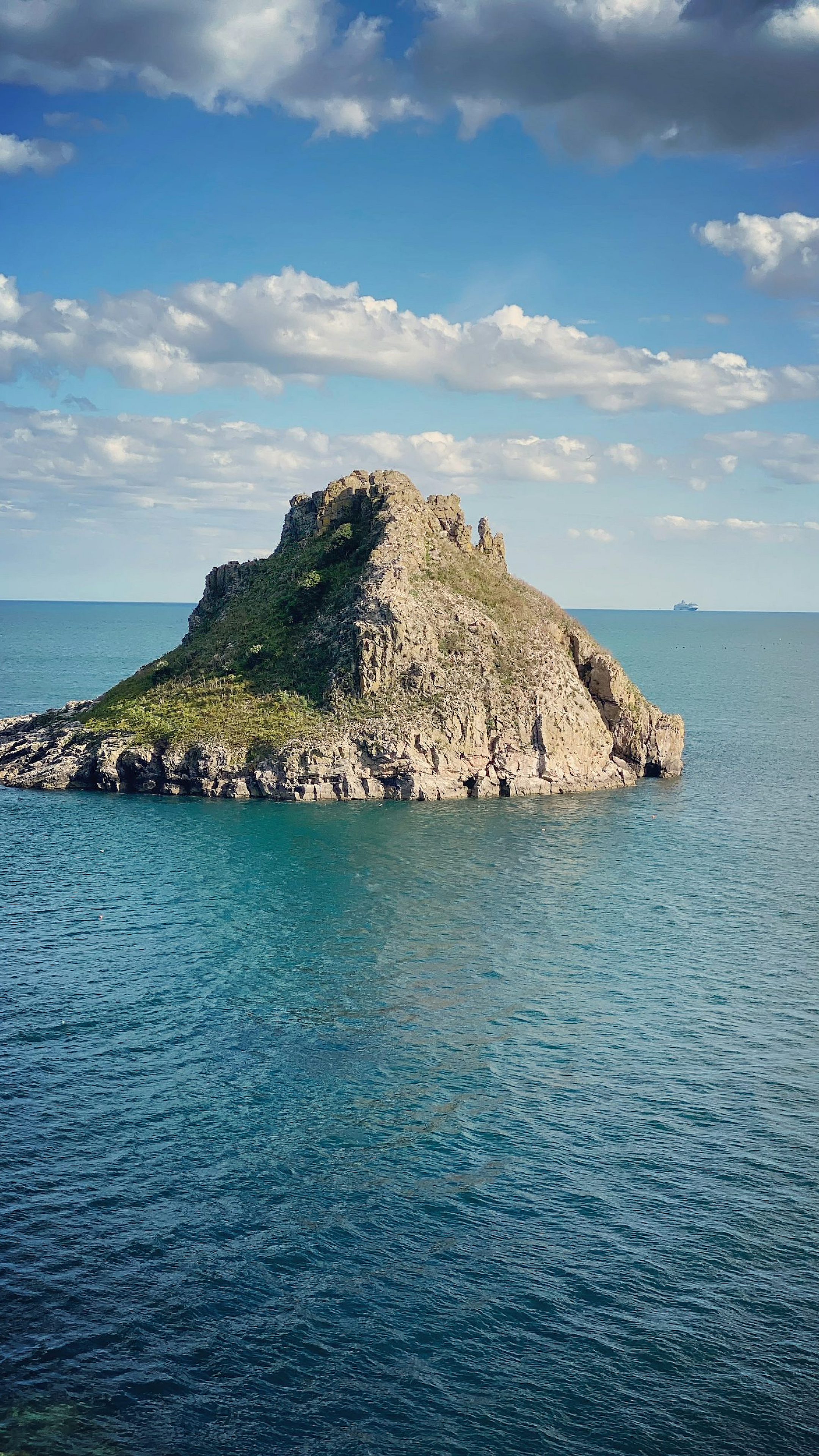 This stunning wallpaper showcases a breathtaking landscape featuring a striking green and brown rock formation dramatically rising from a vibrant blue sea. The scene is set under a blue and white cloudy sky, bathed in the warm light of daytime. The coastal setting offers a sense of majestic nature and raw geology.