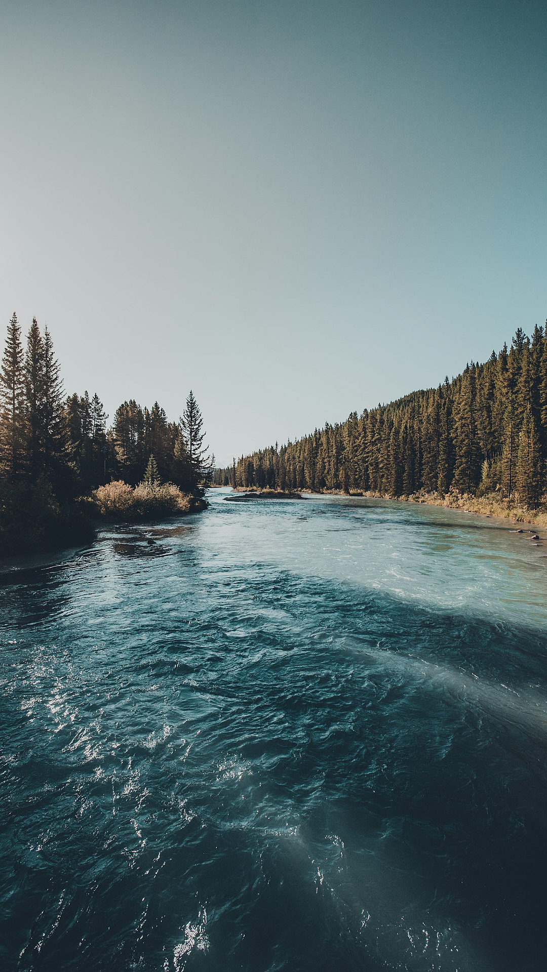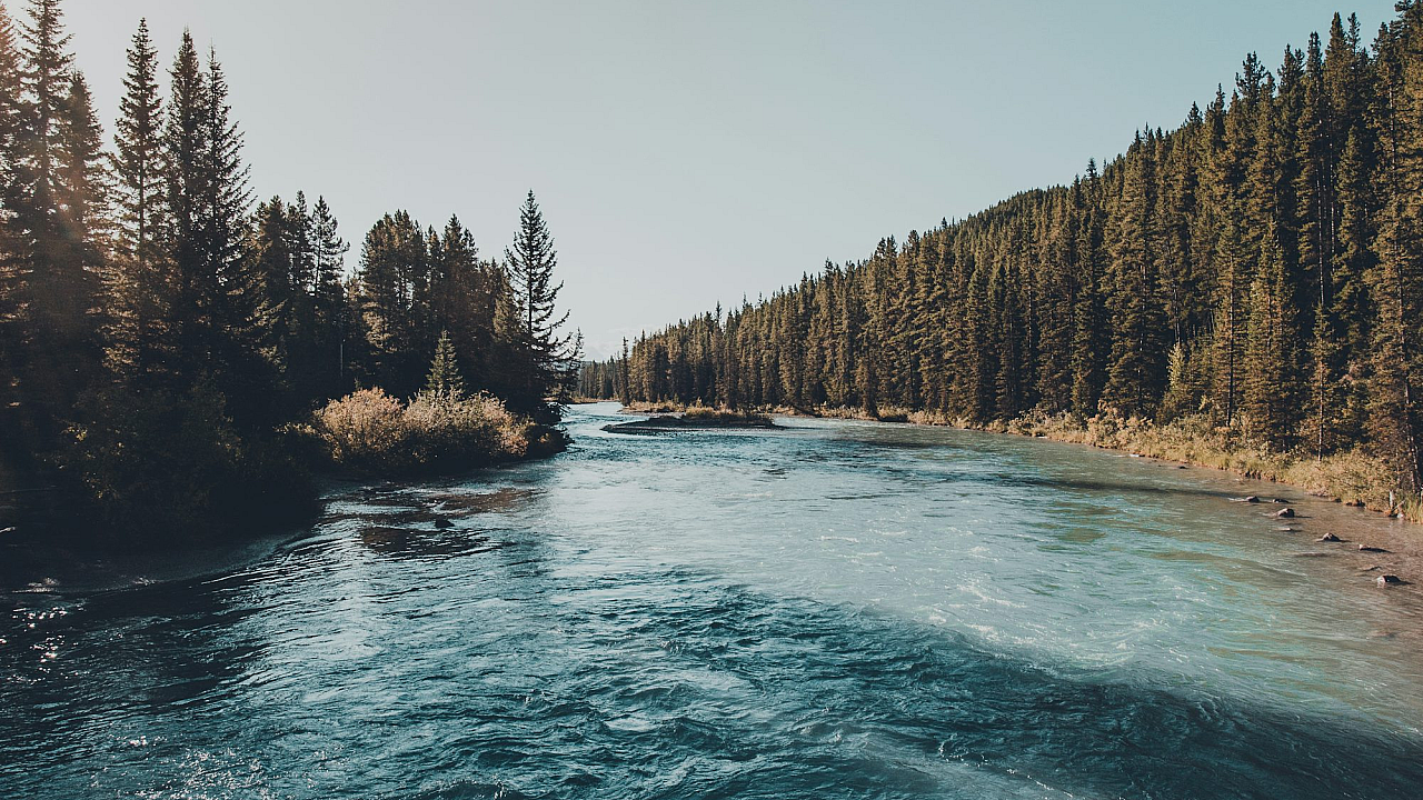 This stunning wallpaper showcases a breathtaking view of lush green trees gracefully lining the banks of a calm river. The sky above is a vibrant blue, indicative of a beautiful daytime scene. The overall impression is one of tranquil and serene nature.