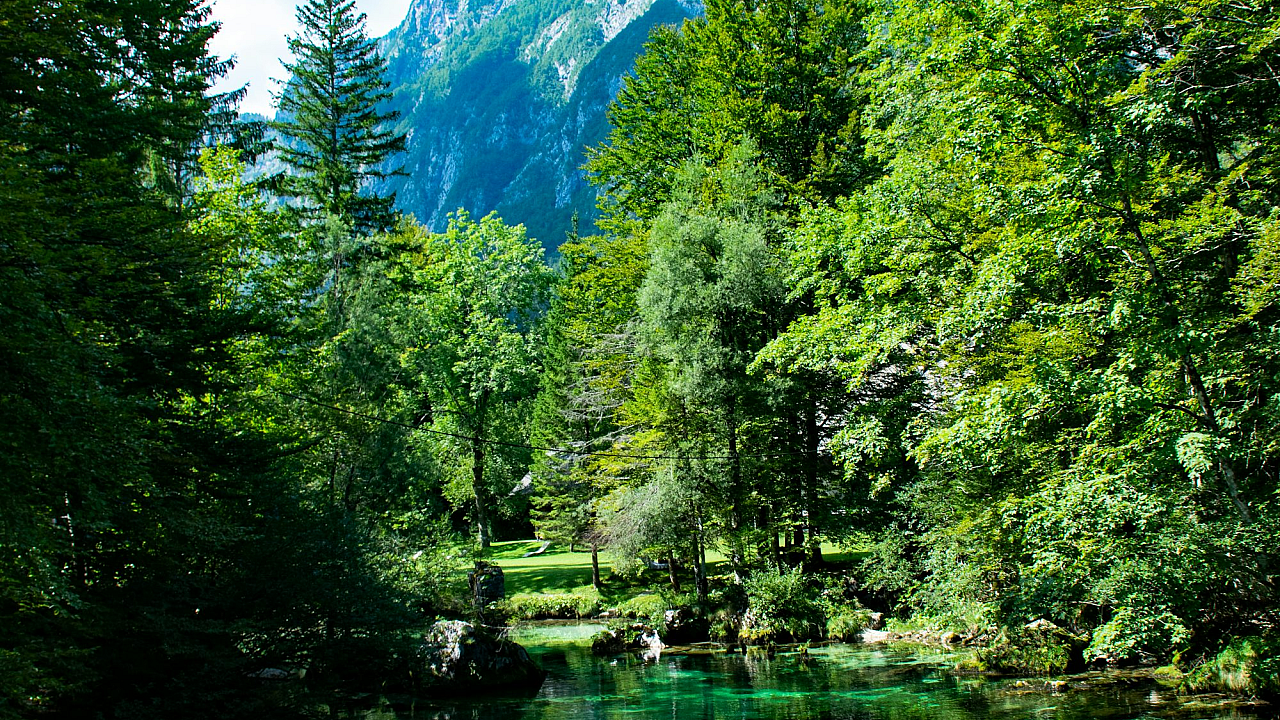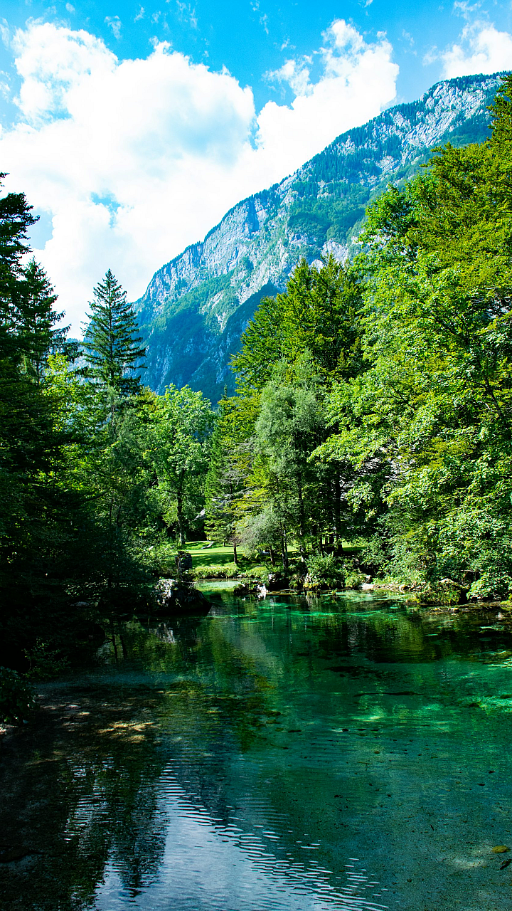 The rich greens of the forest or woods contrast beautifully with the deep blue of the sky, while the still water adds a touch of reflective serenity. This wallpaper is perfect for those who appreciate the beauty of the outdoors and seek a calming visual escape.