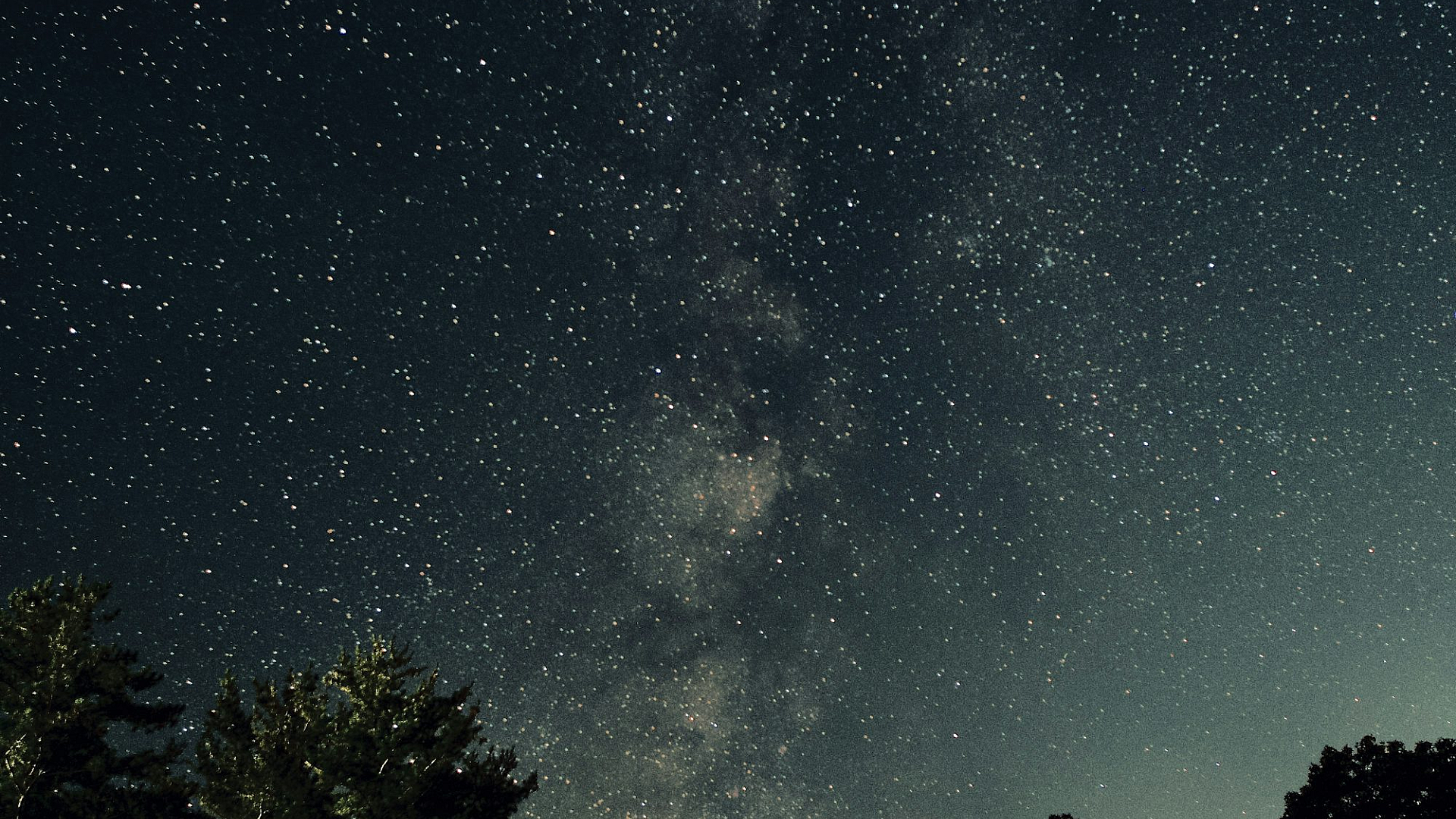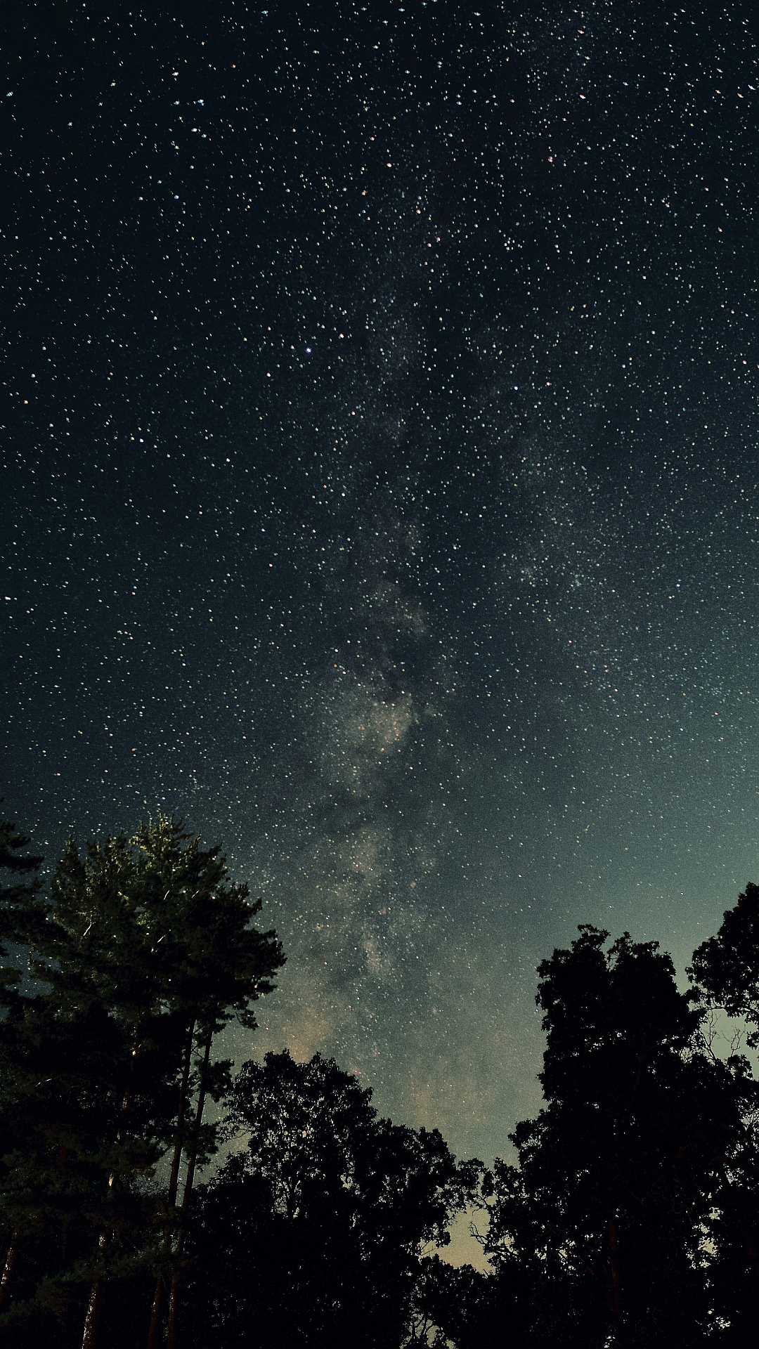Keywords: green trees, blue sky, night, nighttime, stars, moon, dark, forest, woods, nature, landscape, scenery, nocturnal, twilight, evening