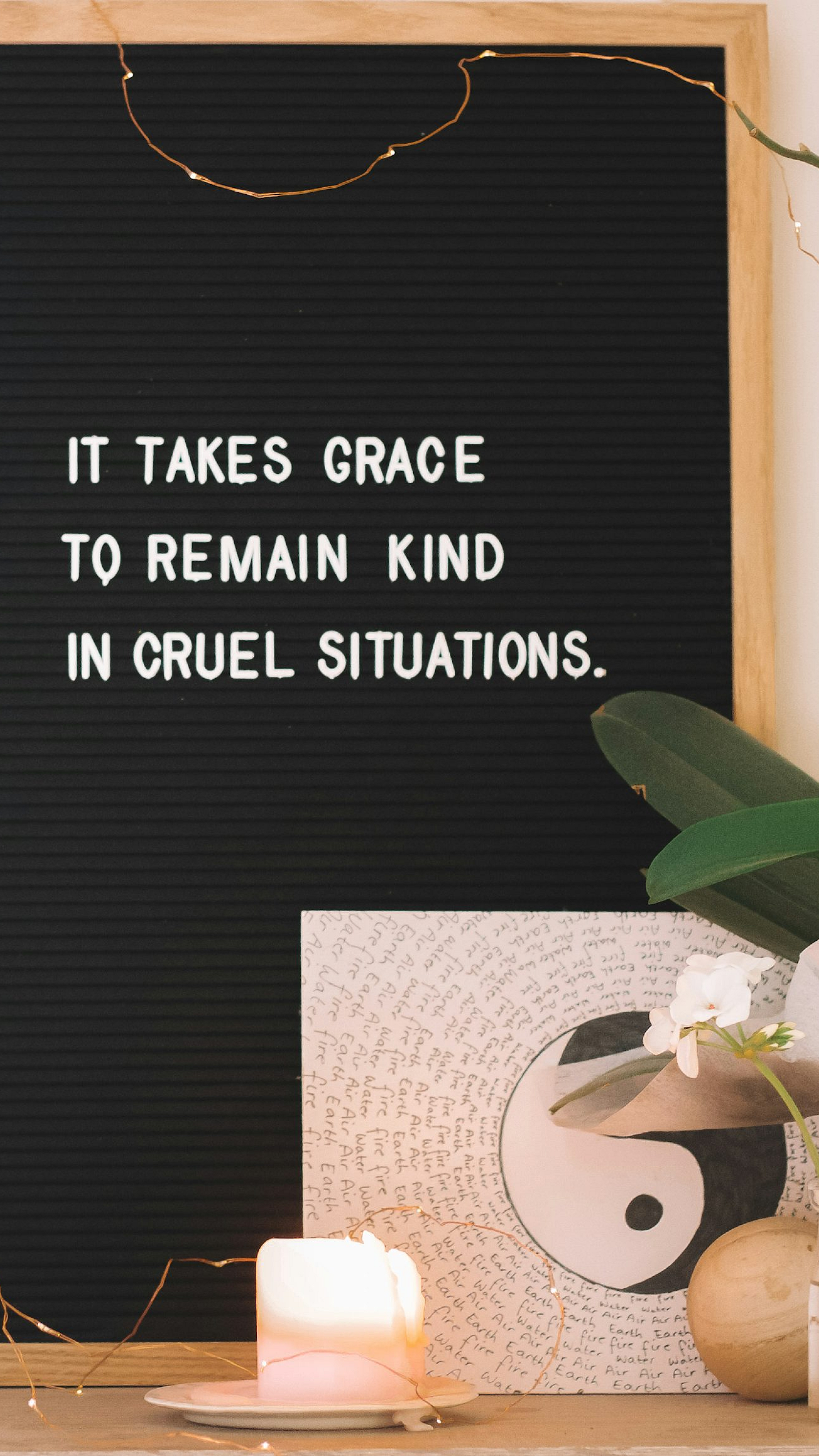 Keywords: grace, kindness, cruelty, compassion, empathy, resilience, strength, positivity, board decor, wall art, inspirational quotes, motivational posters, home decor, positive vibes, difficult situations
