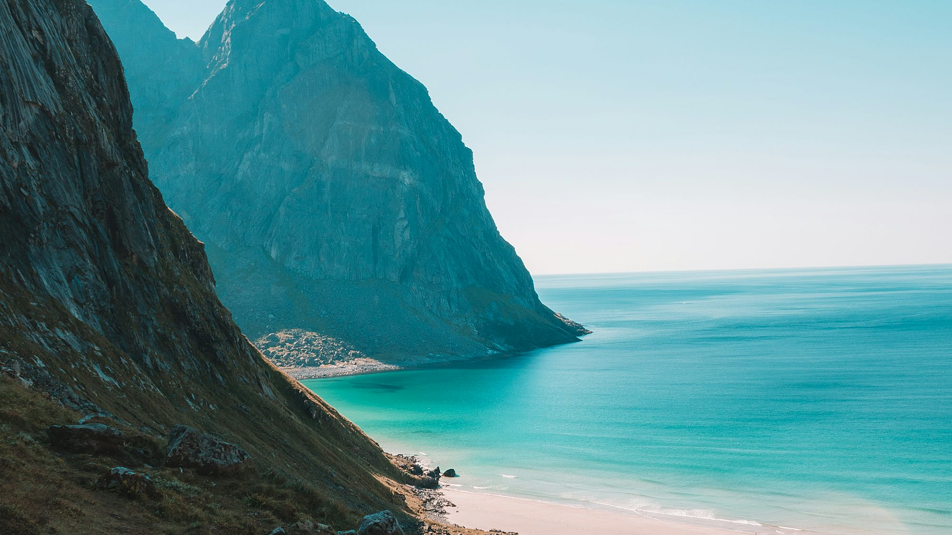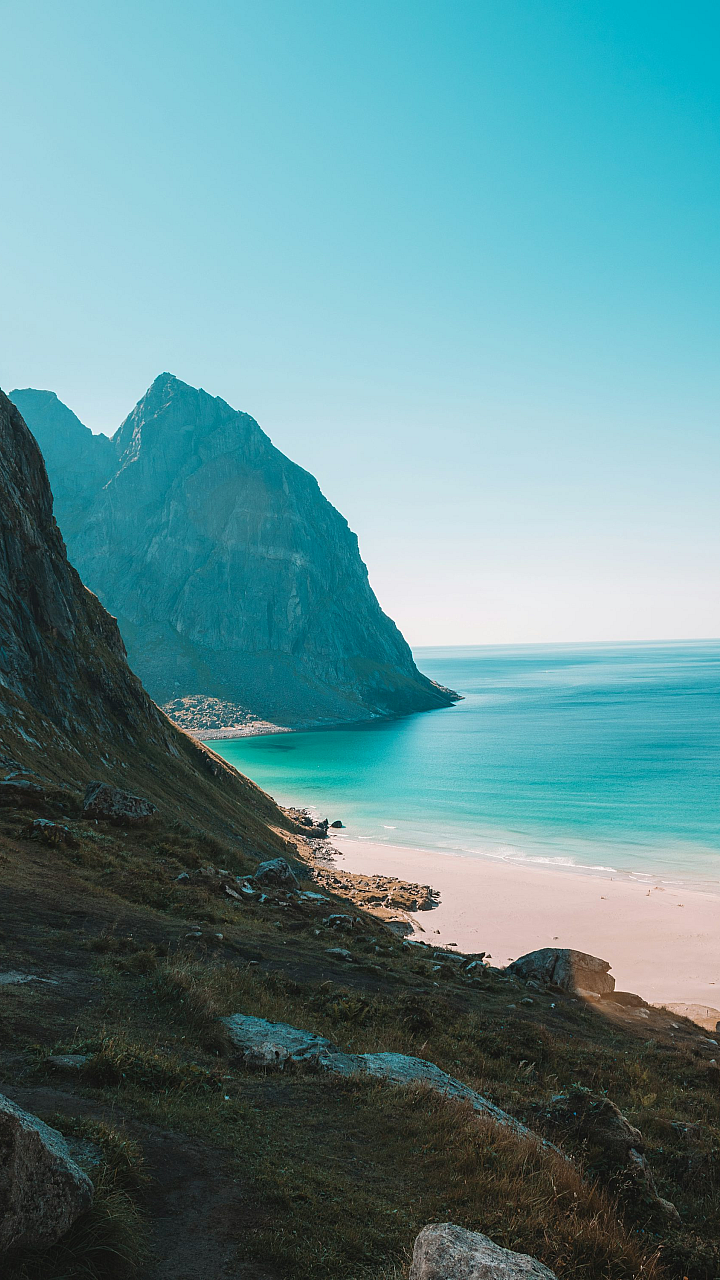 beach, mountain, landscape, seascape, coast, shoreline, ocean, sea, sand, rocks, waves, water, nature, scenery, panorama