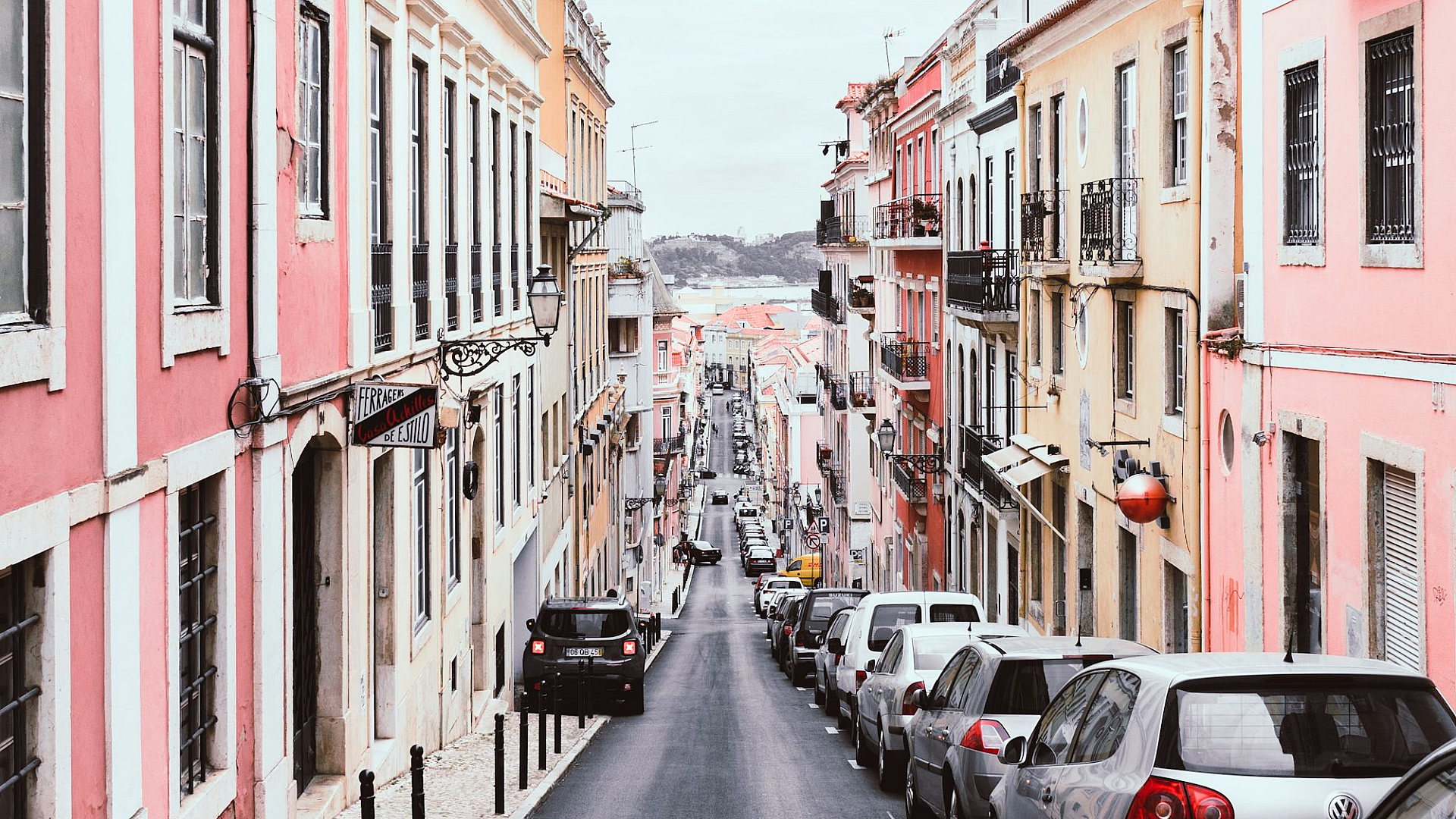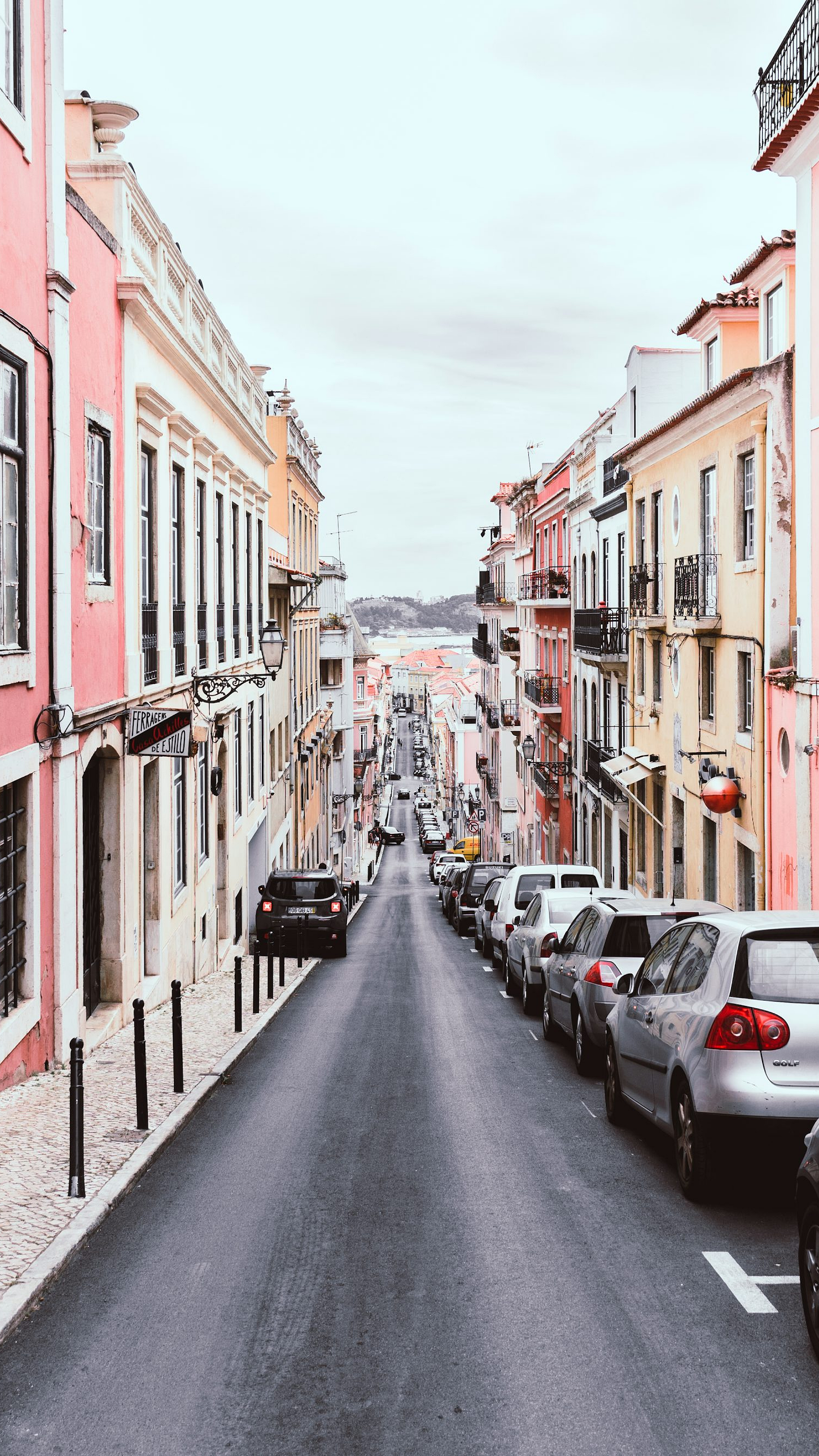 Keywords: line of vehicles, vehicles, cars, road, two-way road, street, buildings, pink buildings, yellow buildings, colorful buildings, daytime, day, cityscape, urban, architecture