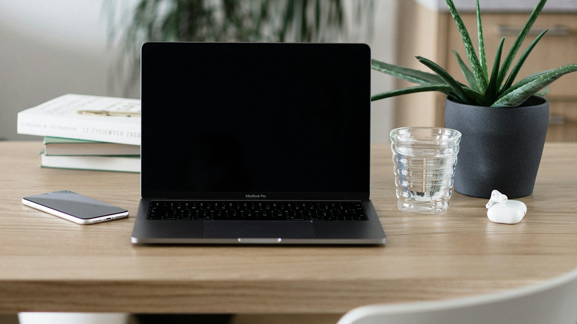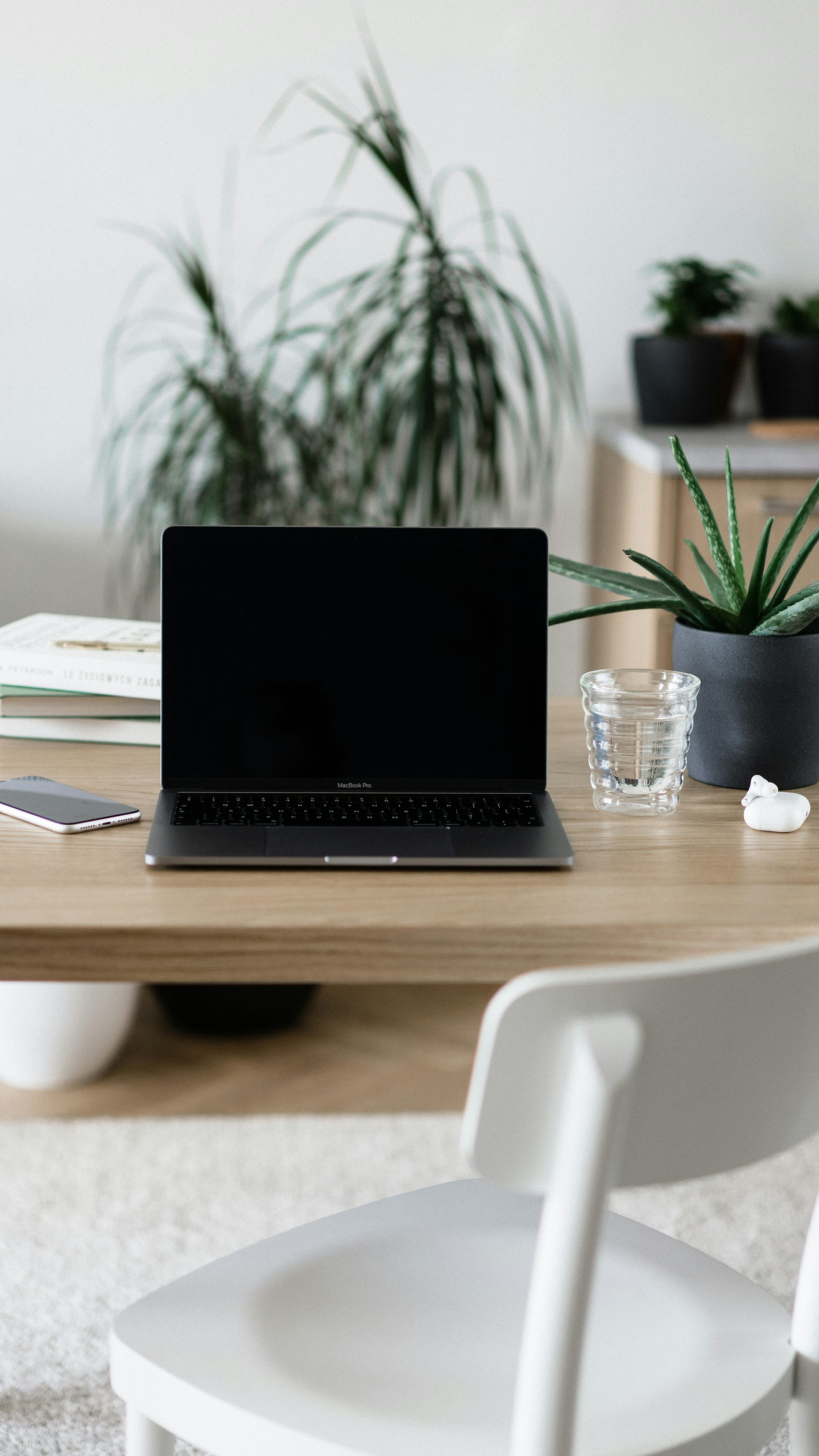 This wallpaper features a Macbook Pro resting on a brown wooden table. The image provides a clean and professional aesthetic, perfect for use as a desktop background.