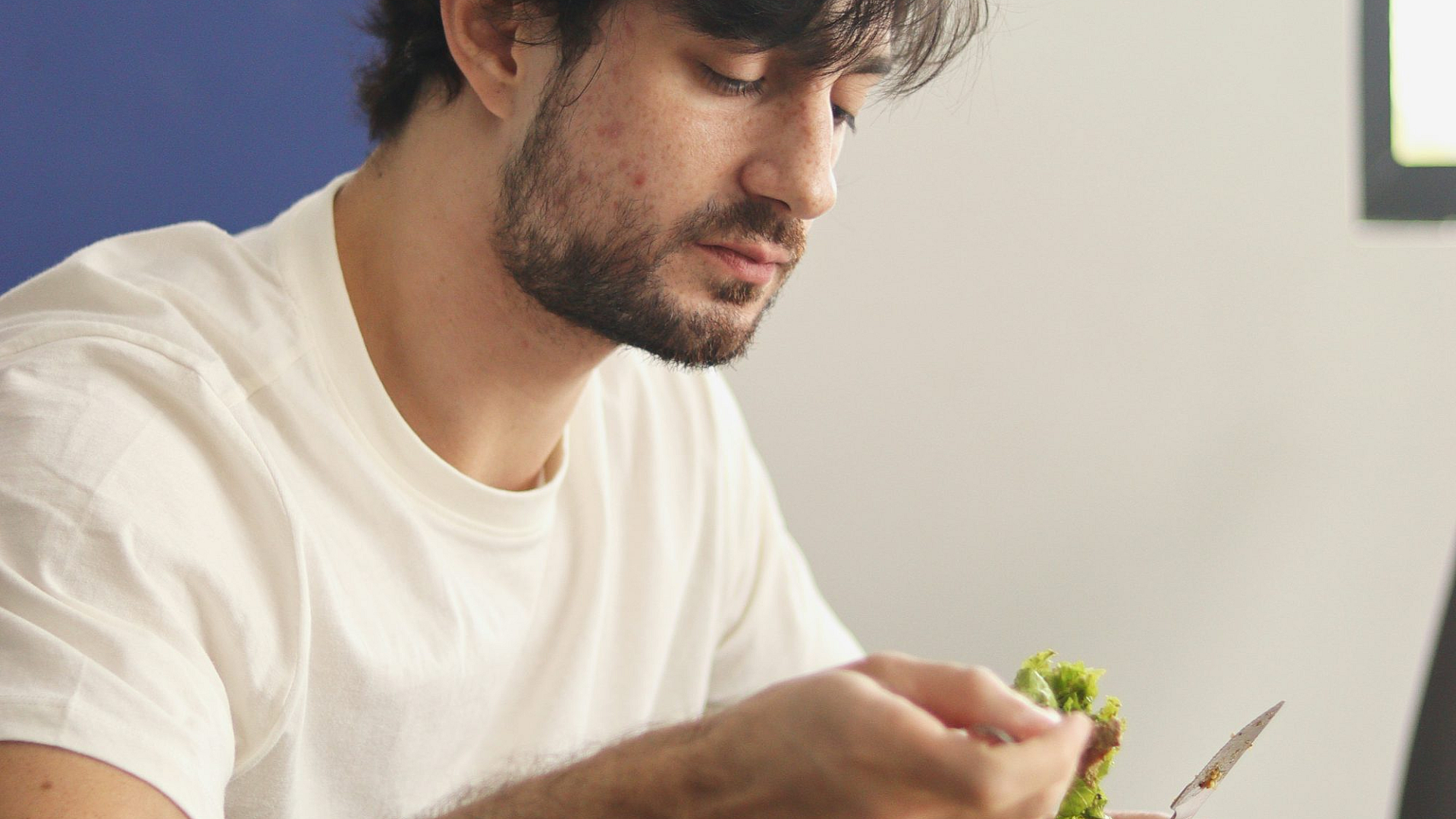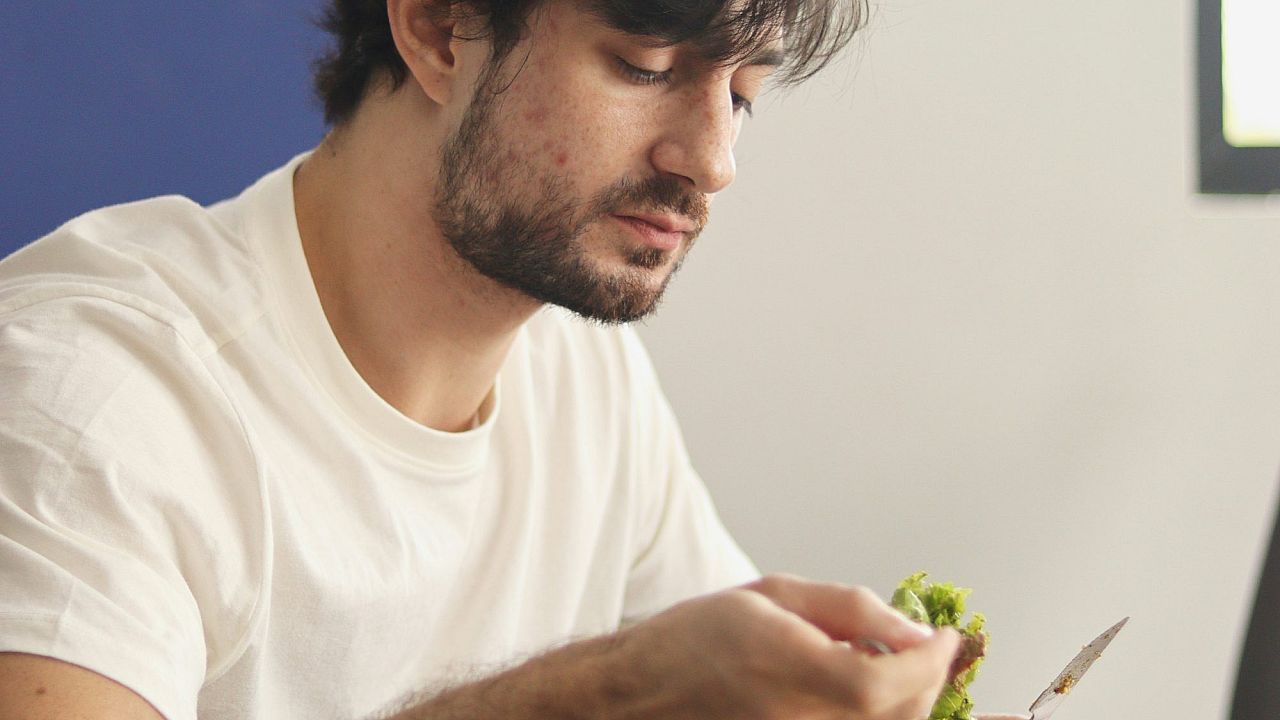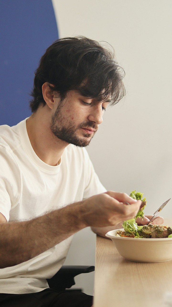 man, eating, salad, table, indoors, meal, lunch, dinner, healthy, food, vegetables, restaurant, dining, room, interior