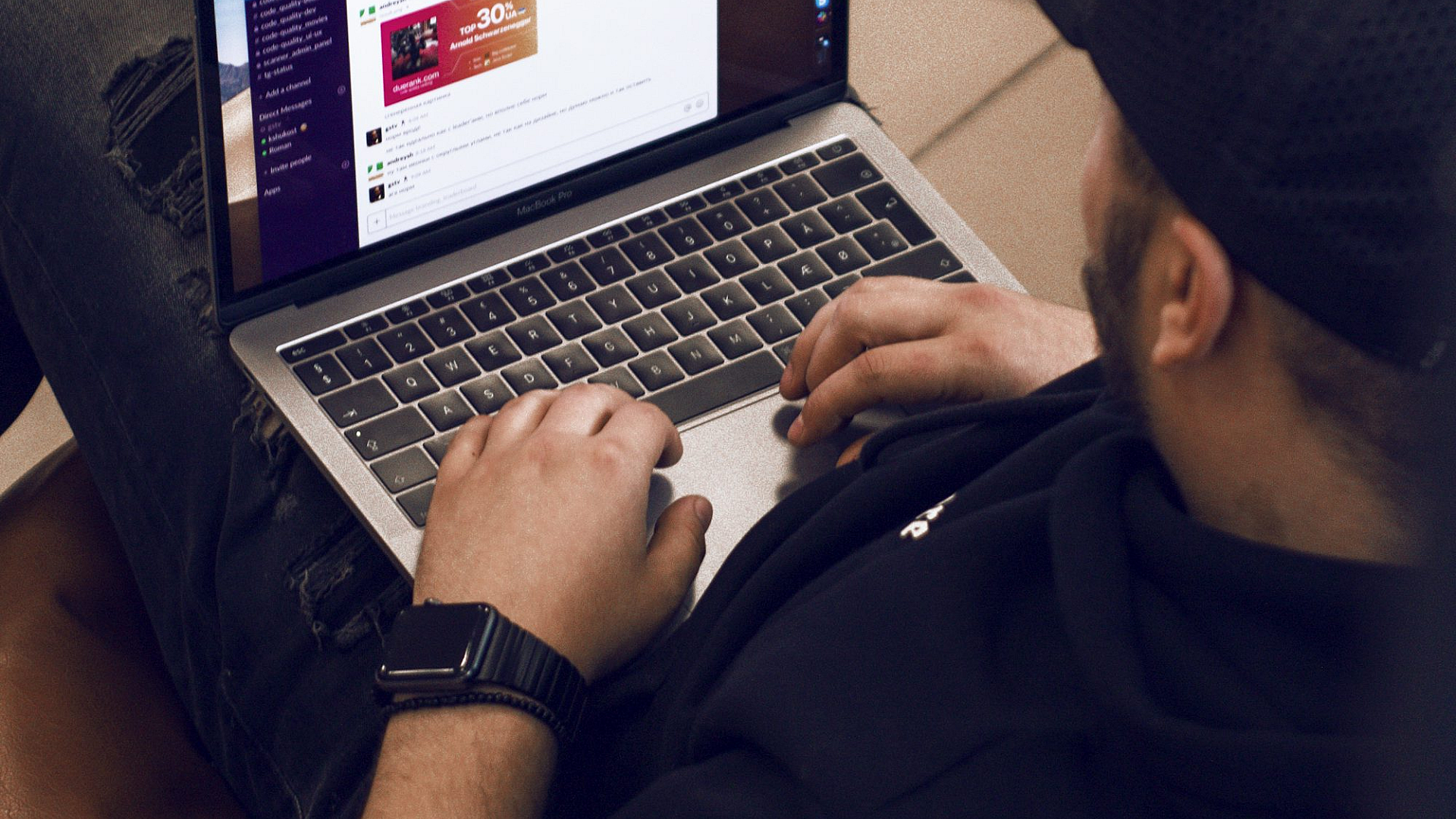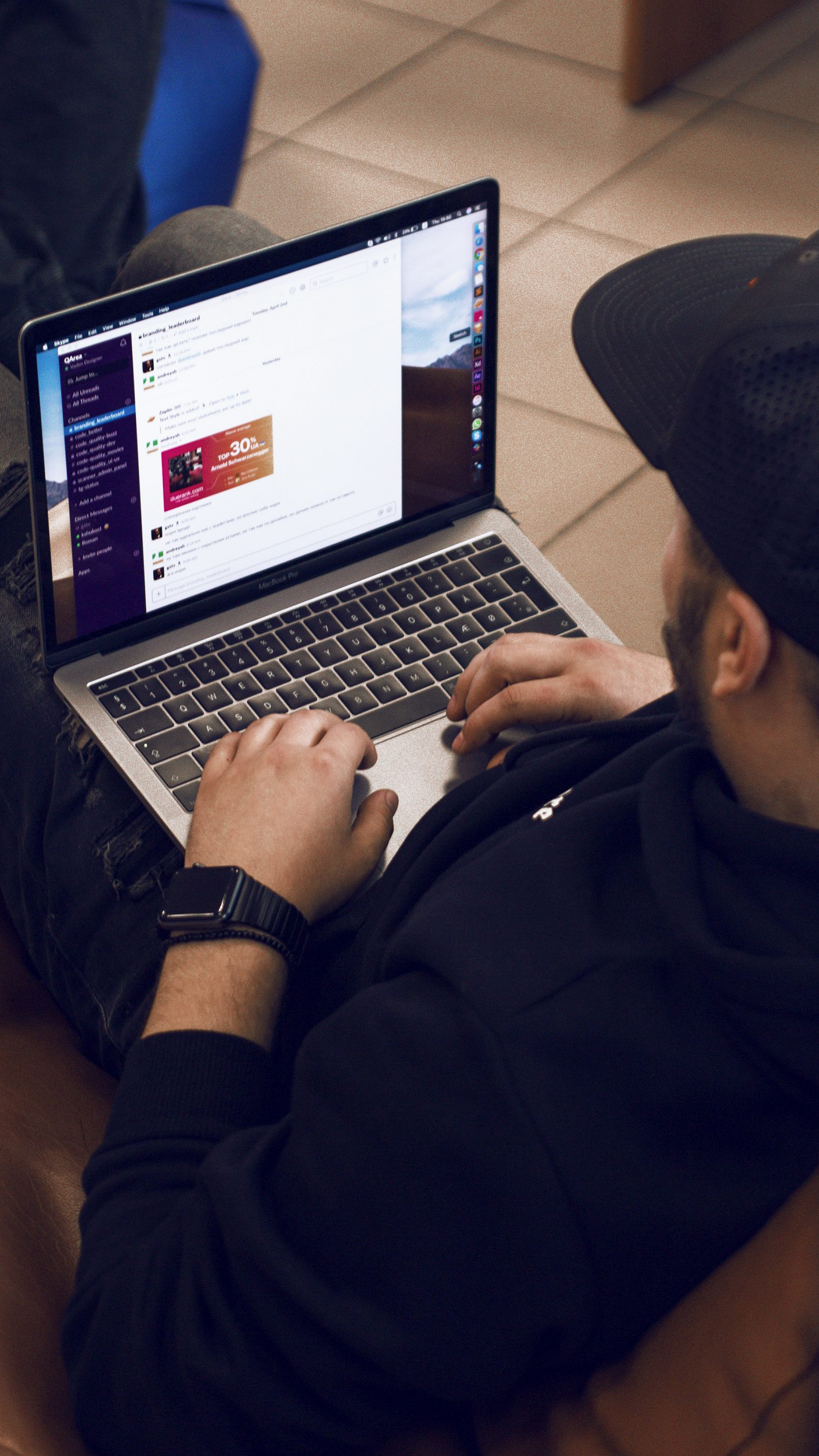 This wallpaper features a man wearing a black jacket, intensely focused on his Macbook Pro. The image evokes a sense of professionalism and concentration, perfect for those who appreciate clean and sophisticated aesthetics.