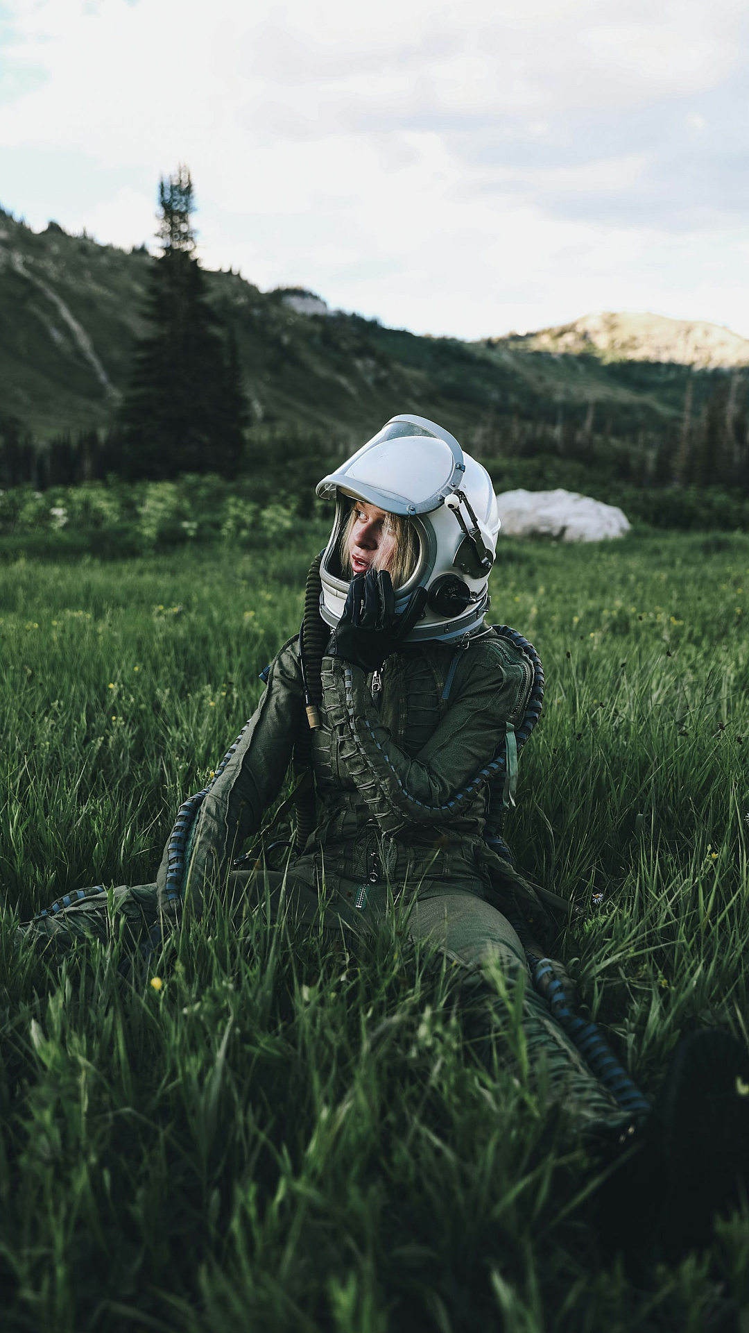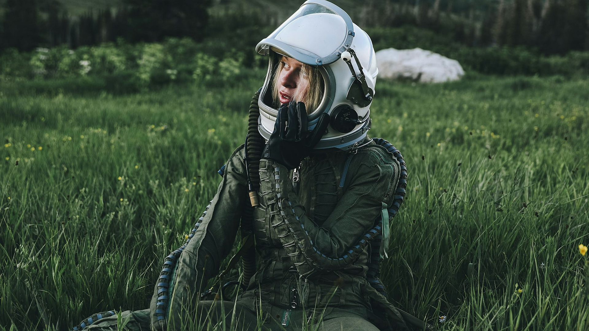 Keywords: man, black jacket, white helmet, green grass, field, daytime, outdoors, sitting, person, male, apparel, clothing, landscape, nature, scenery