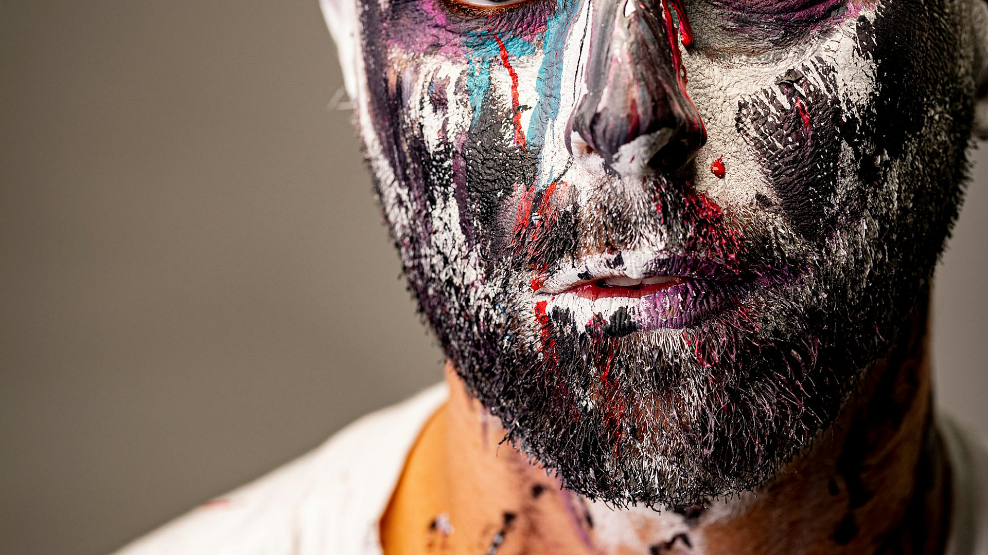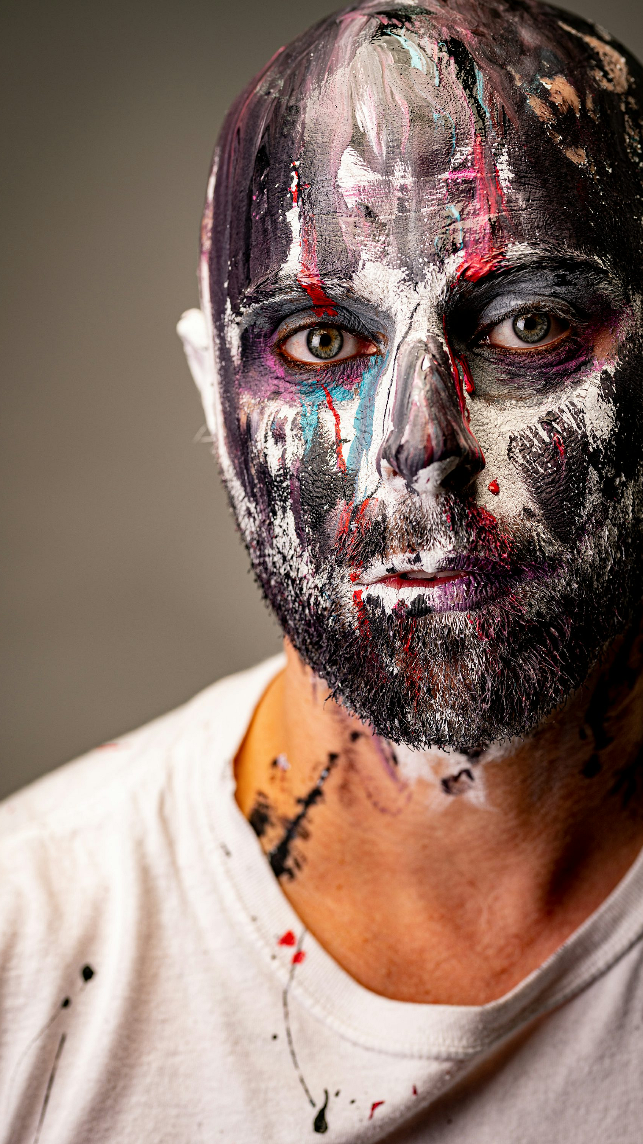 Keywords: man, male, portrait, face paint, body paint, white shirt, crew neck, clothing, apparel, fashion, artistic, creative, design, wallpaper, background, image