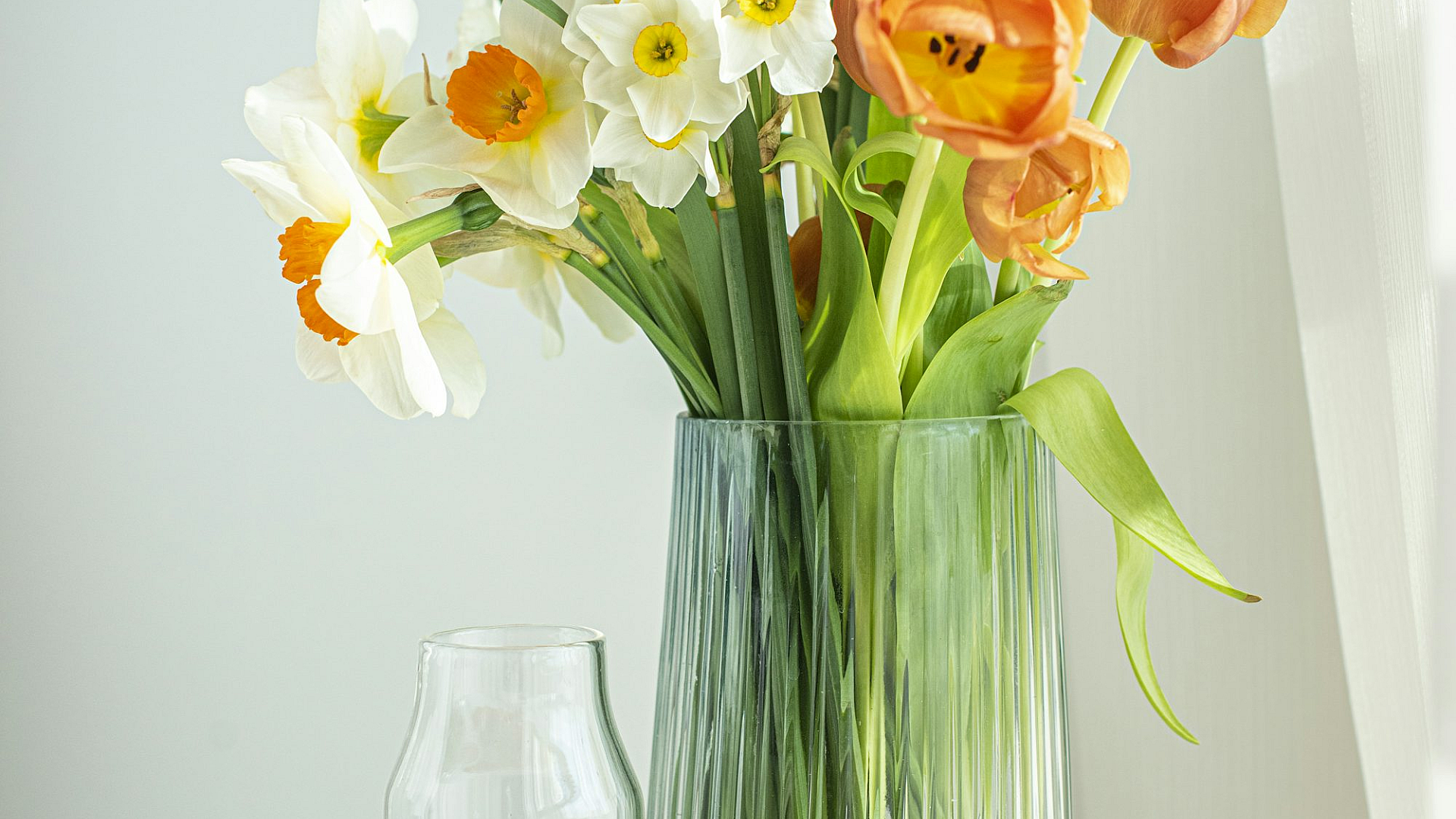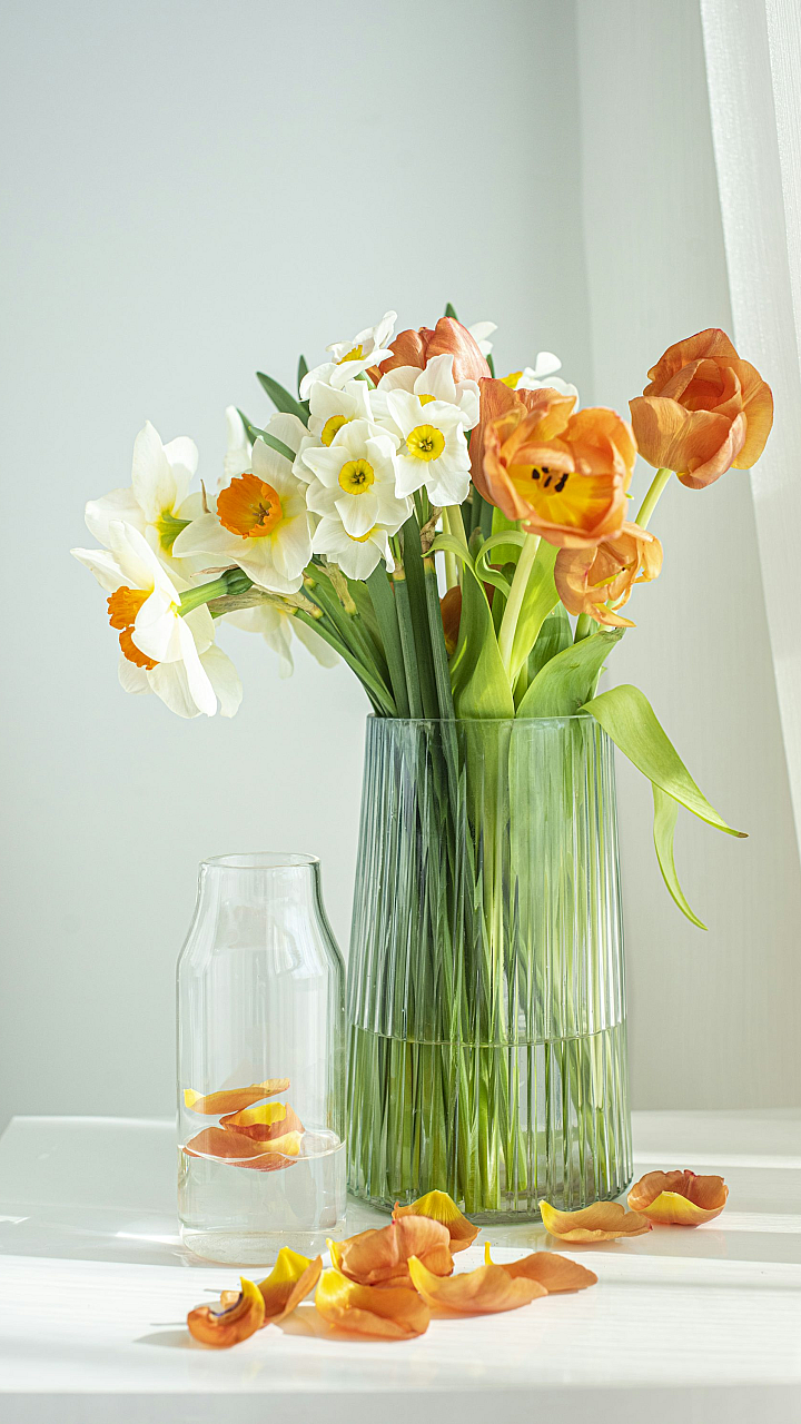 orange flowers, yellow flowers, glass vase, floral wallpaper, flower wallpaper, bright flowers, sunny flowers, clear glass, transparent vase, vibrant colors, floral arrangement, bouquet, spring flowers, summer flowers, nature wallpaper