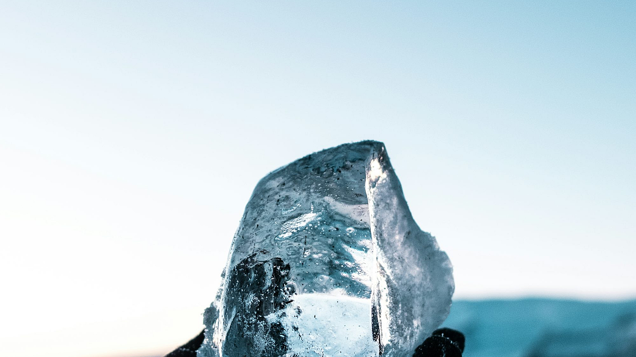 This wallpaper features a captivating image of a person delicately holding a large block of ice. The scene evokes a sense of cold and winter, with the frozen water glistening in the light. The image could be interpreted in many ways, perhaps representing the fragility of nature, or the endurance of the human spirit in the face of harsh conditions. The icy texture and the chilly atmosphere create a visually striking contrast.