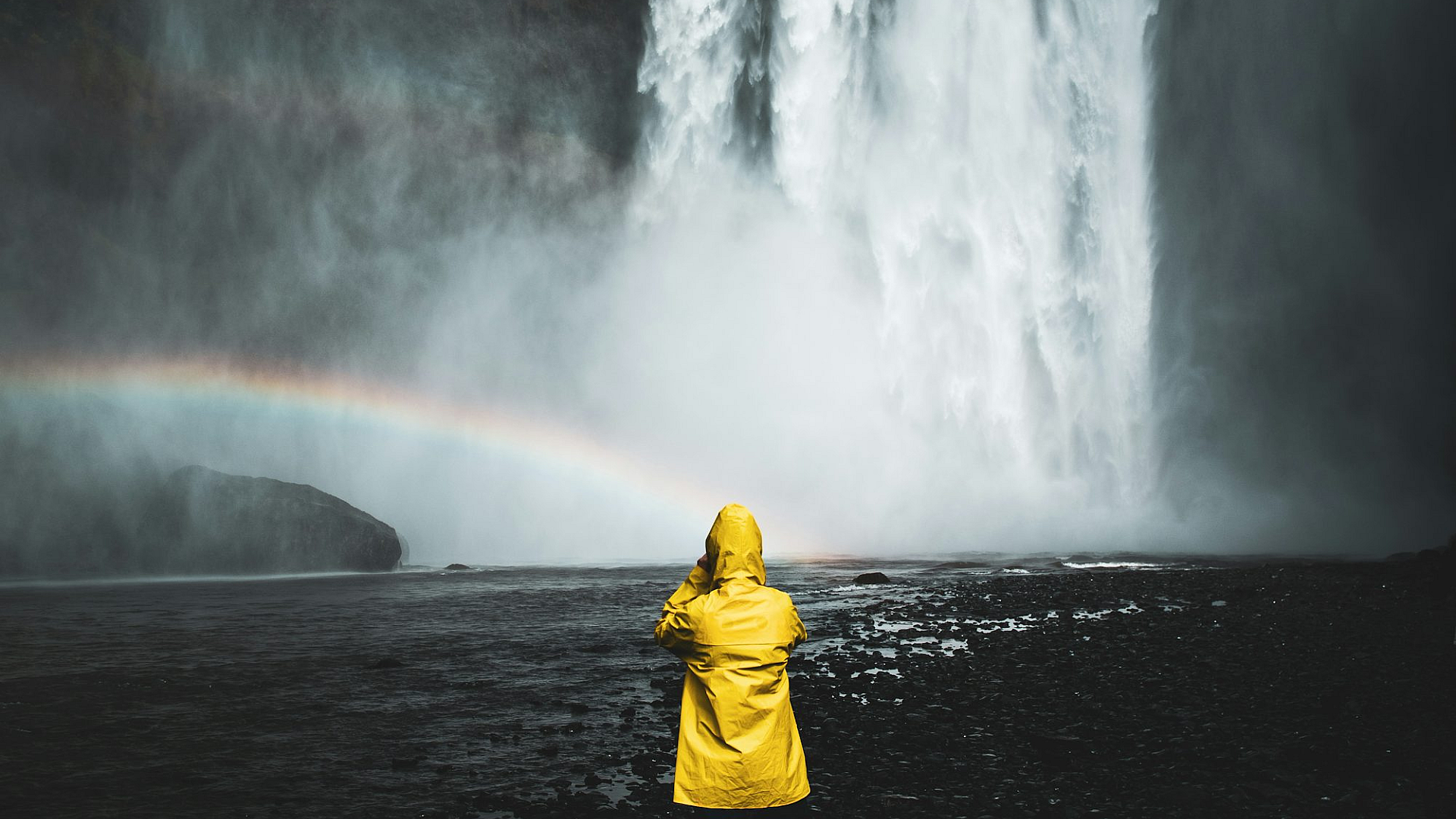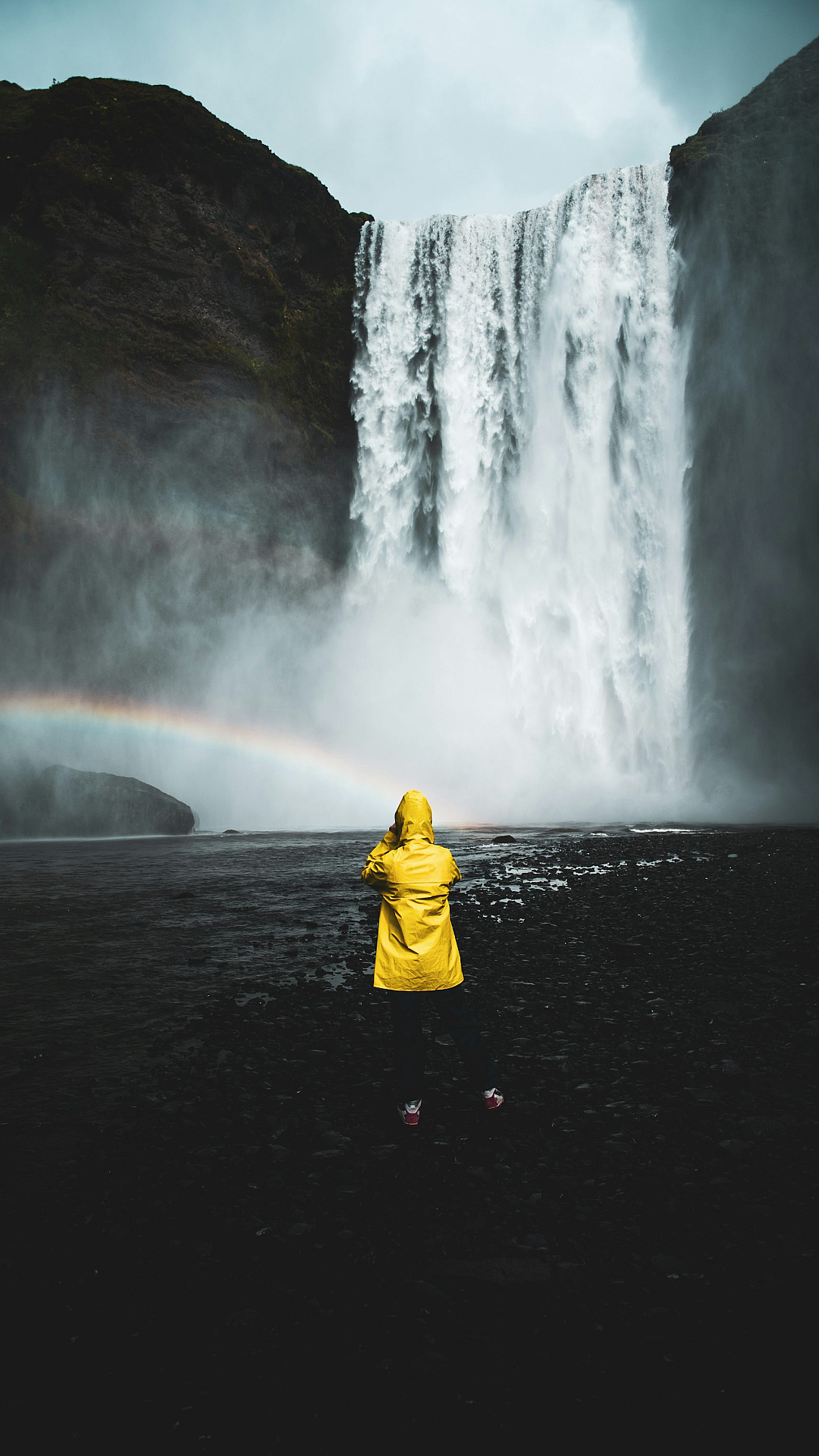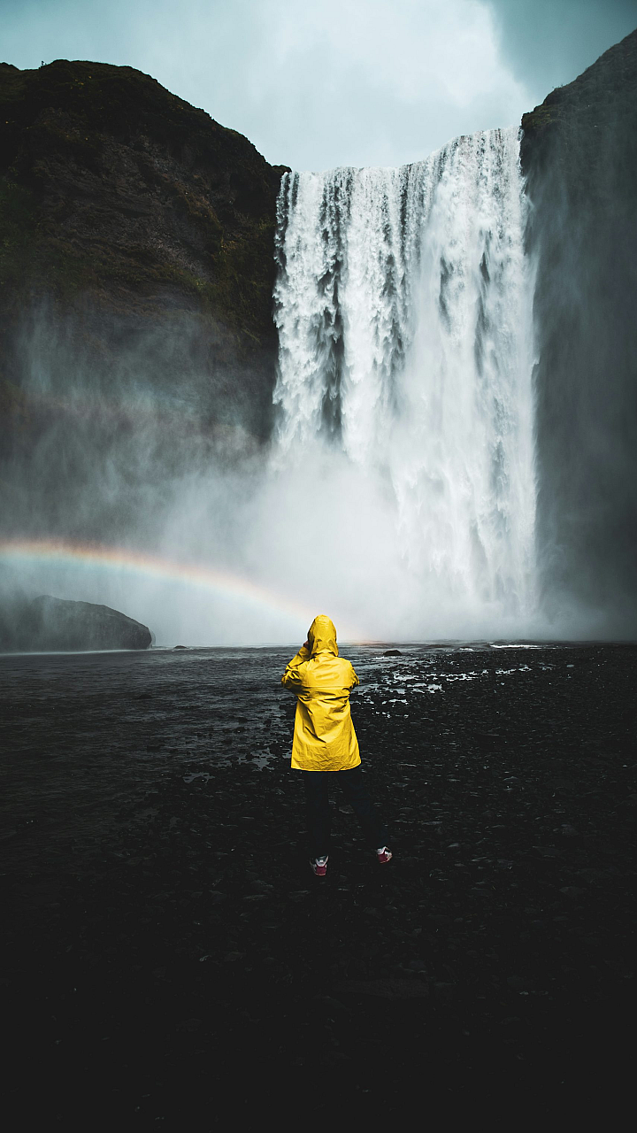 The person in yellow hoodie is a focal point, creating a sense of scale and emphasizing the grandeur of the waterfall. The overall composition is balanced and visually appealing, making it an excellent choice for a desktop or mobile background. The image offers a tranquil escape, blending the urban element of the hoodie with the raw power of nature. It’s a perfect blend of human presence and the magnificence of a natural scenic wonder. This wallpaper is ideal for those seeking a nature wallpaper or a scenic wallpaper that evokes a sense of awe and serenity.