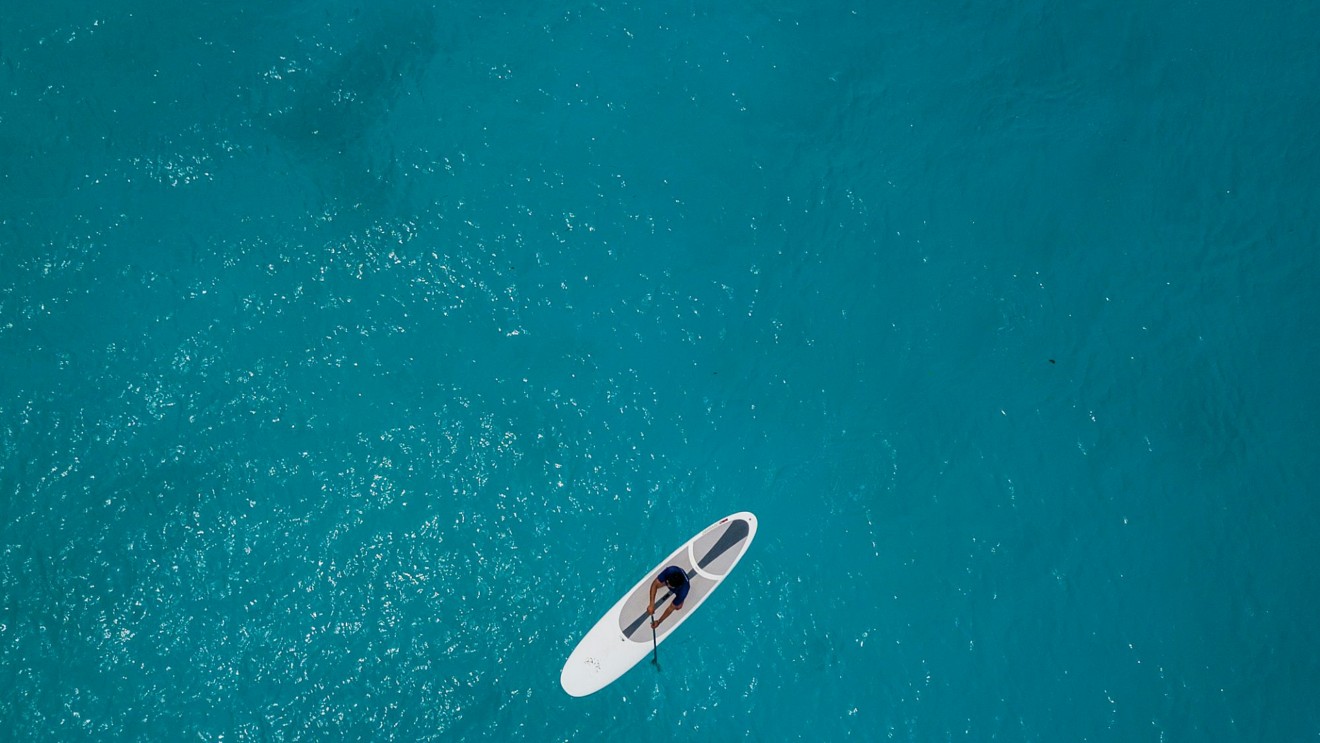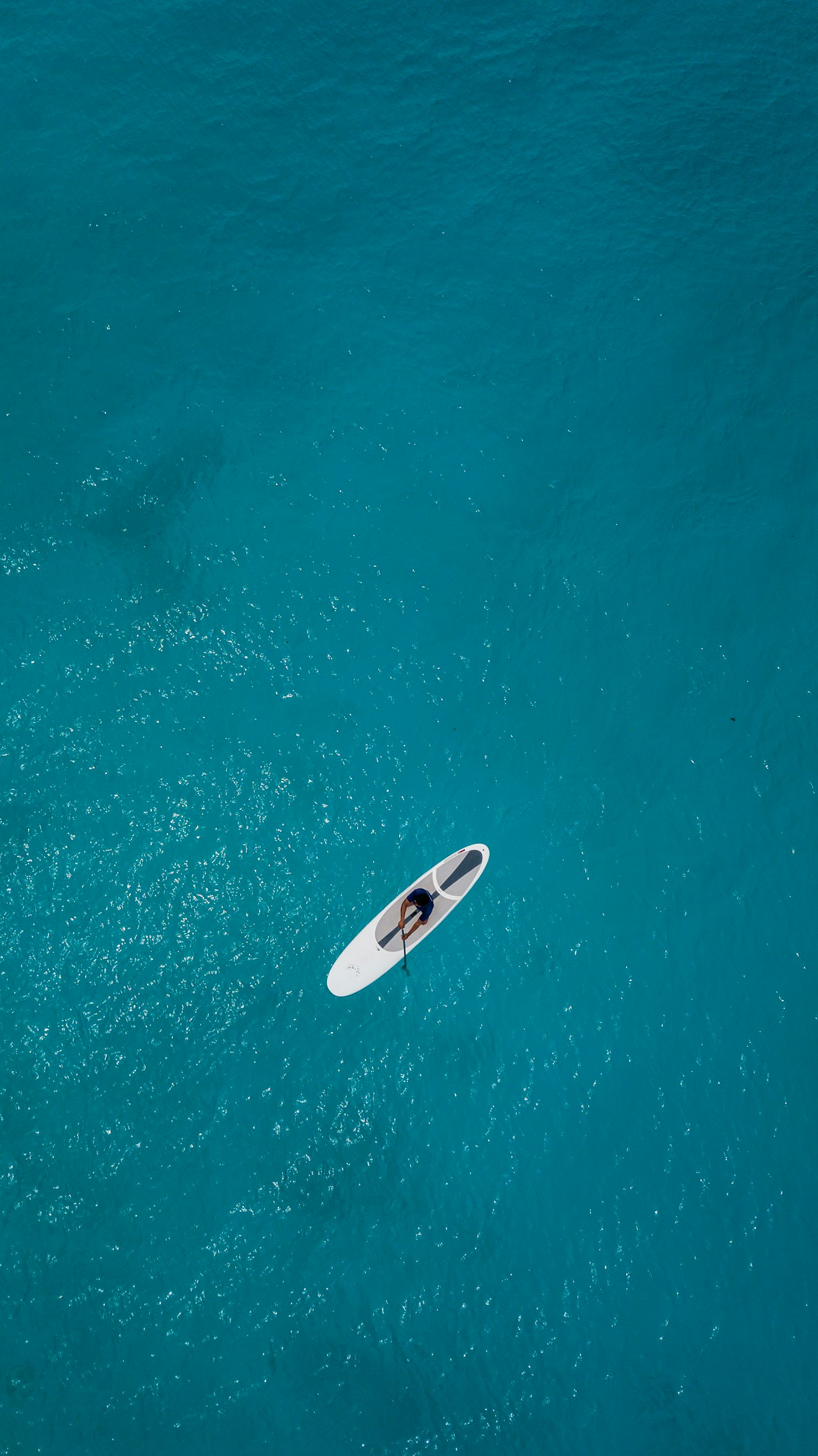 Download this wallpaper now and bring the excitement of surfing to your desktop or mobile screen. The calming yet energetic image of the person on the white surfboard is a perfect way to infuse your digital space with the spirit of adventure and the beauty of the sea.