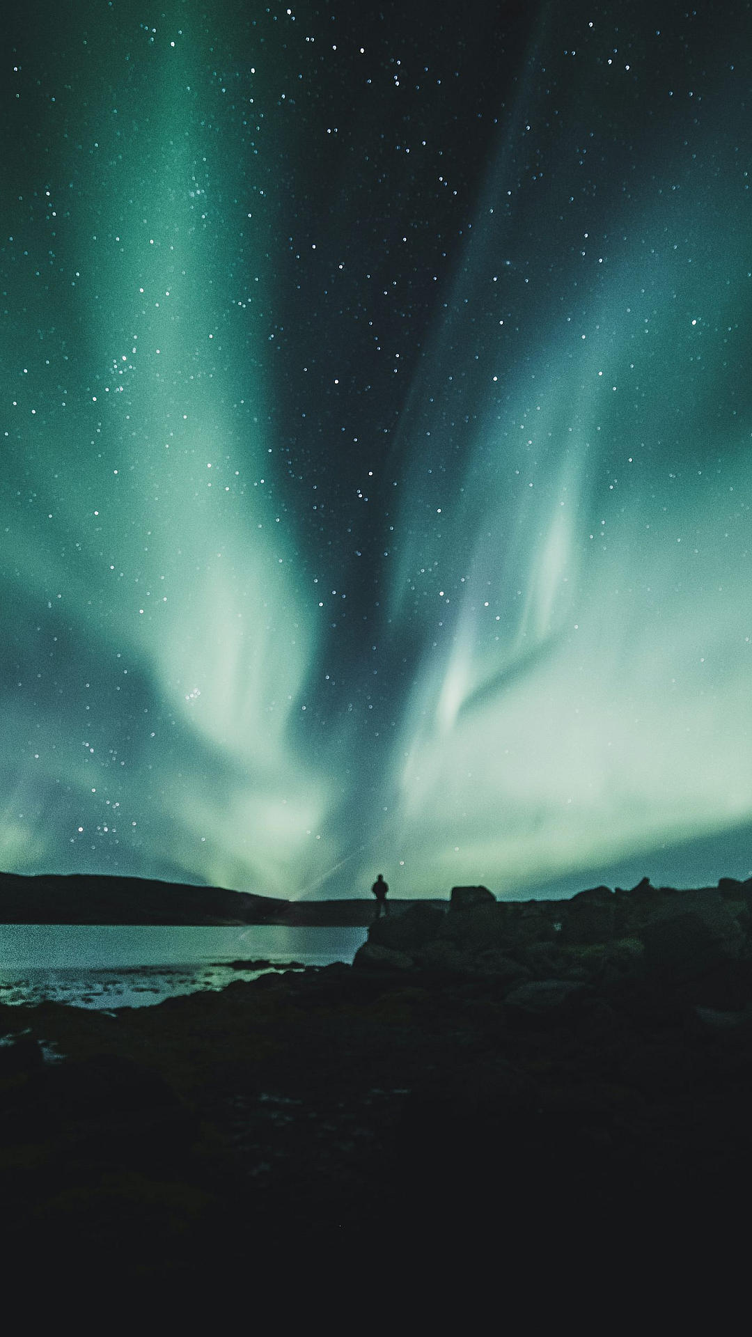 Wallpaper Person Standing Near Body of Water During Aurora Borealis