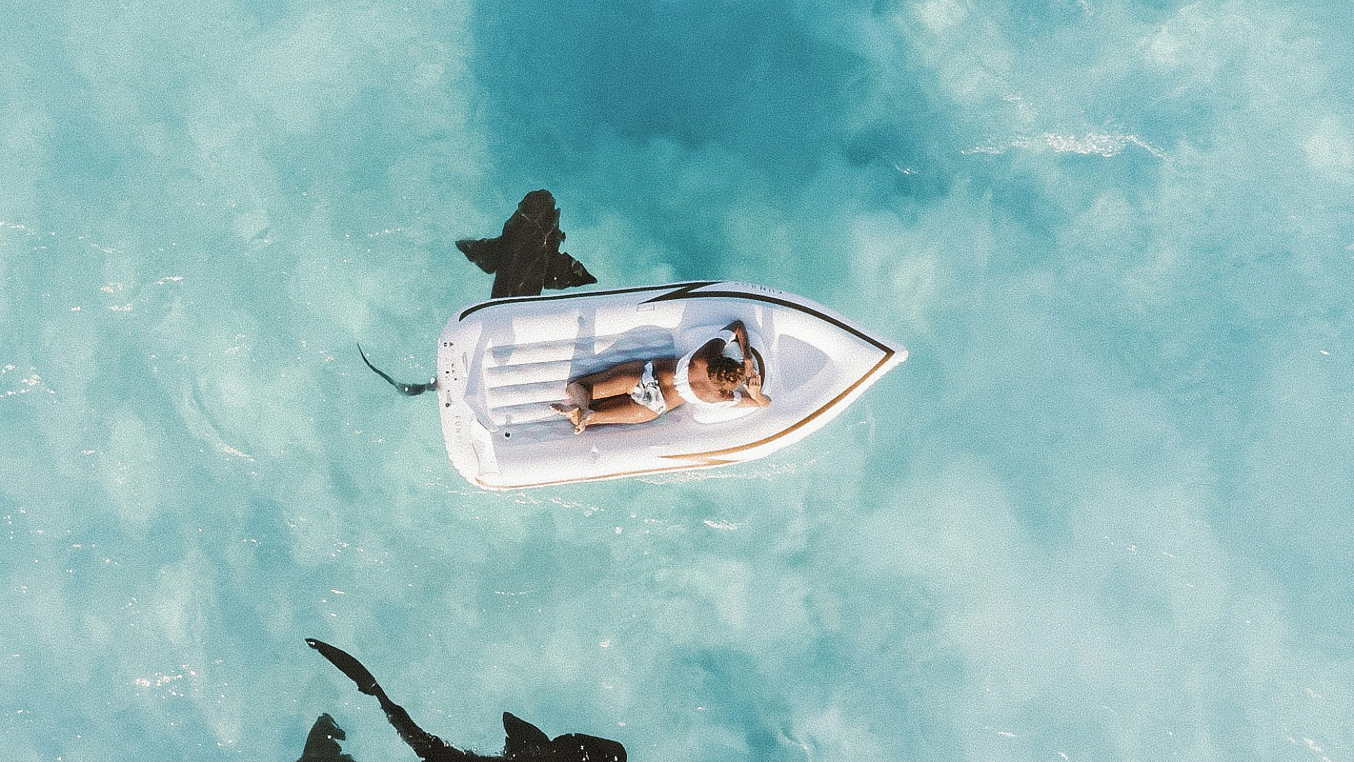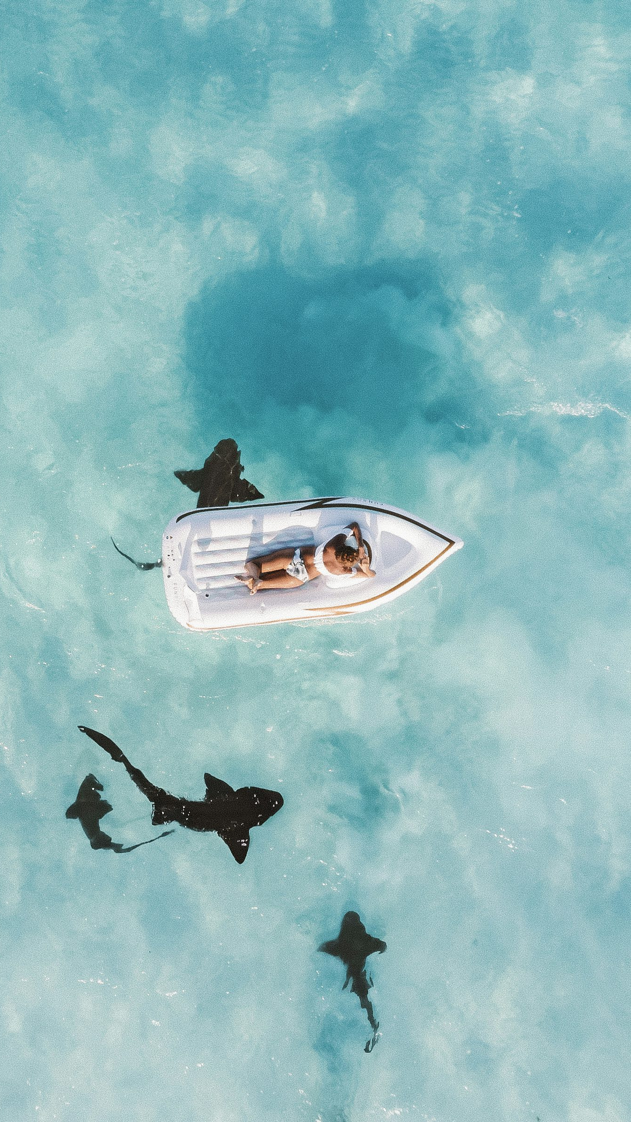This wallpaper features a captivating scene of a person luxuriating in the sun while comfortably perched on a pristine white inflatable buoy. The bright, sunny skies provide a stunning backdrop, enhancing the overall feeling of serenity and relaxation.