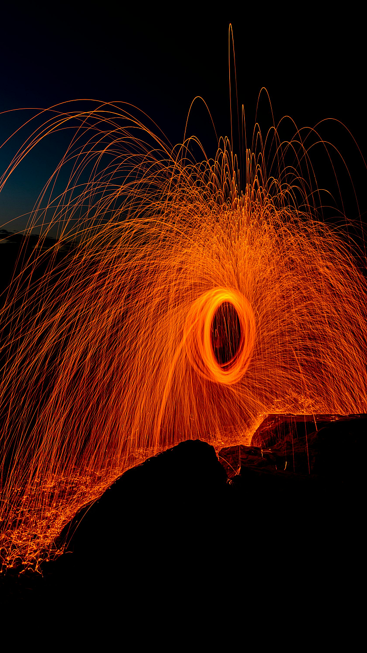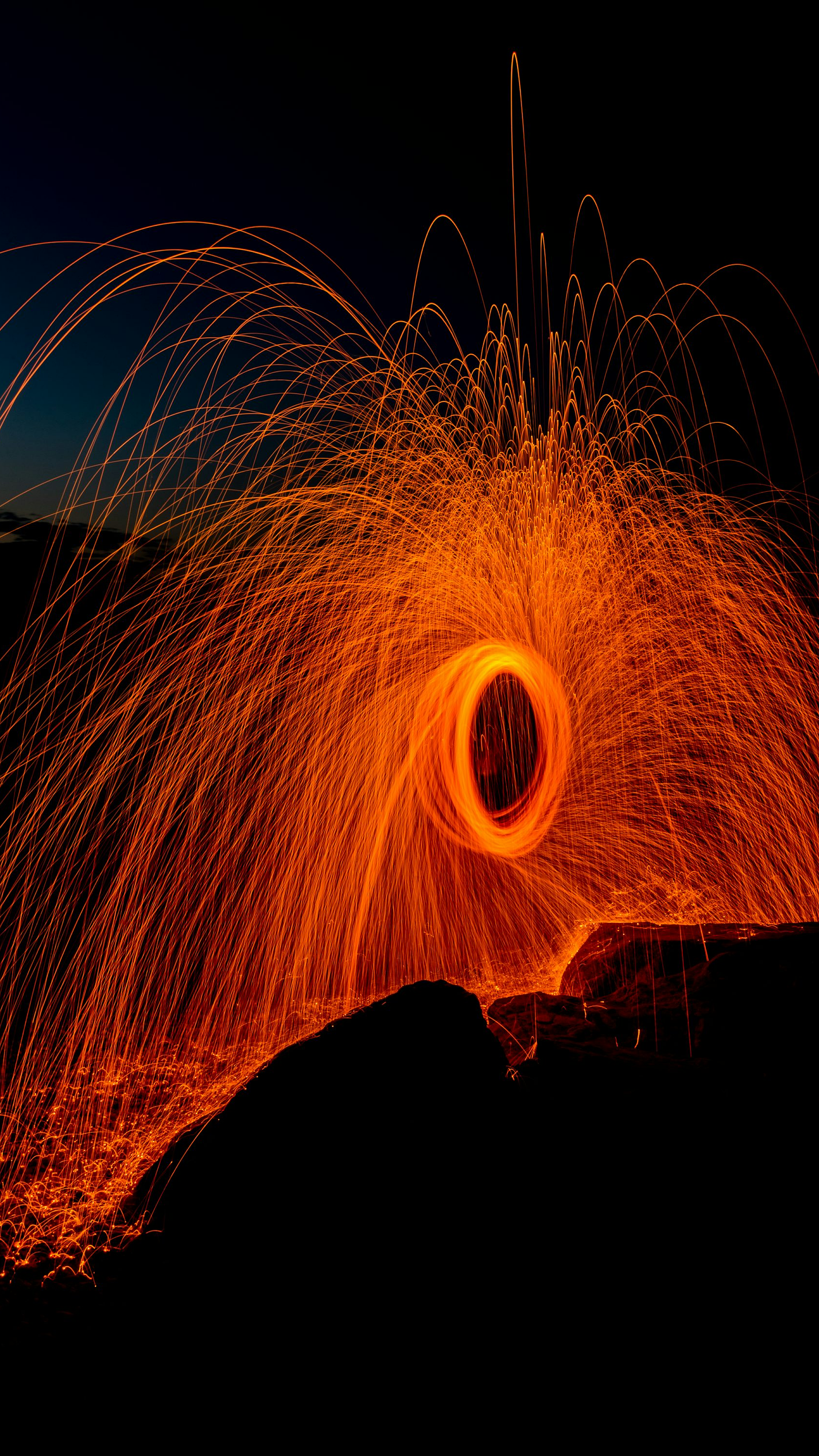 steel wool, photography, fire, sparkler, light painting, night photography, long exposure, abstract, texture, glowing, fiery, bright, metallic, round, spinning