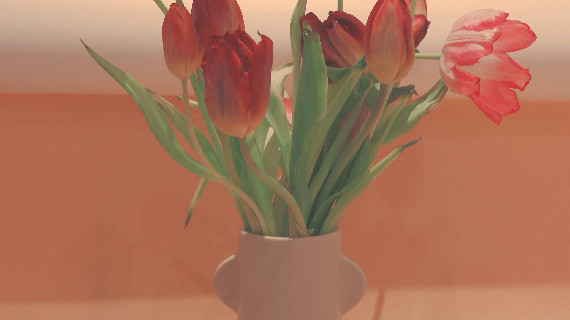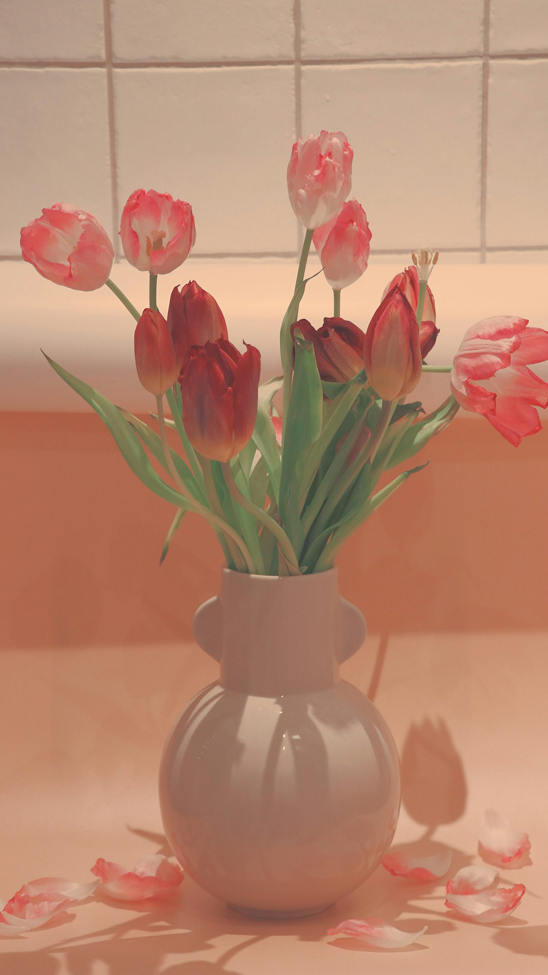 pink tulips, tulips, pink flowers, flowers, vase, glass vase, clear vase, floral wallpaper, spring wallpaper, nature wallpaper, flower wallpaper, pink wallpaper, minimalist wallpaper, simple wallpaper, elegant wallpaper