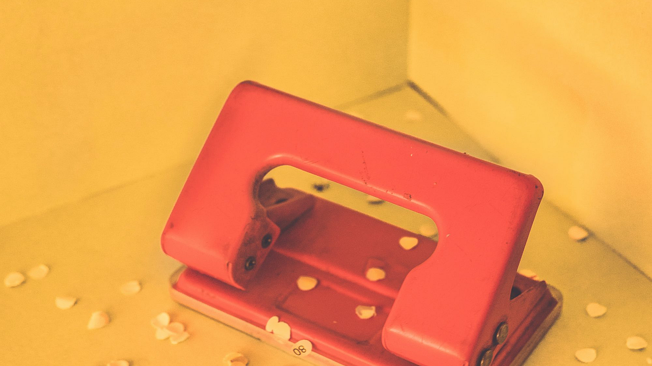 red 2-hole puncher with paper debris