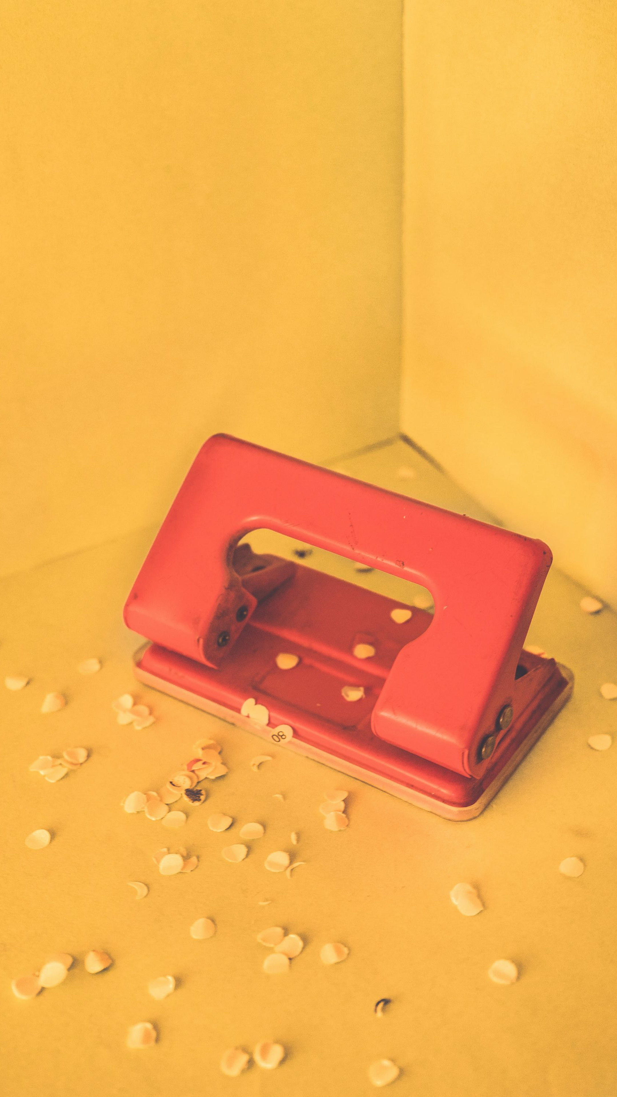 red, puncher, hole puncher, two-hole puncher, paper, debris, office supplies, stationery, red punch, paper scraps, shredded paper, office equipment, hole punch, paper confetti, red office supplies