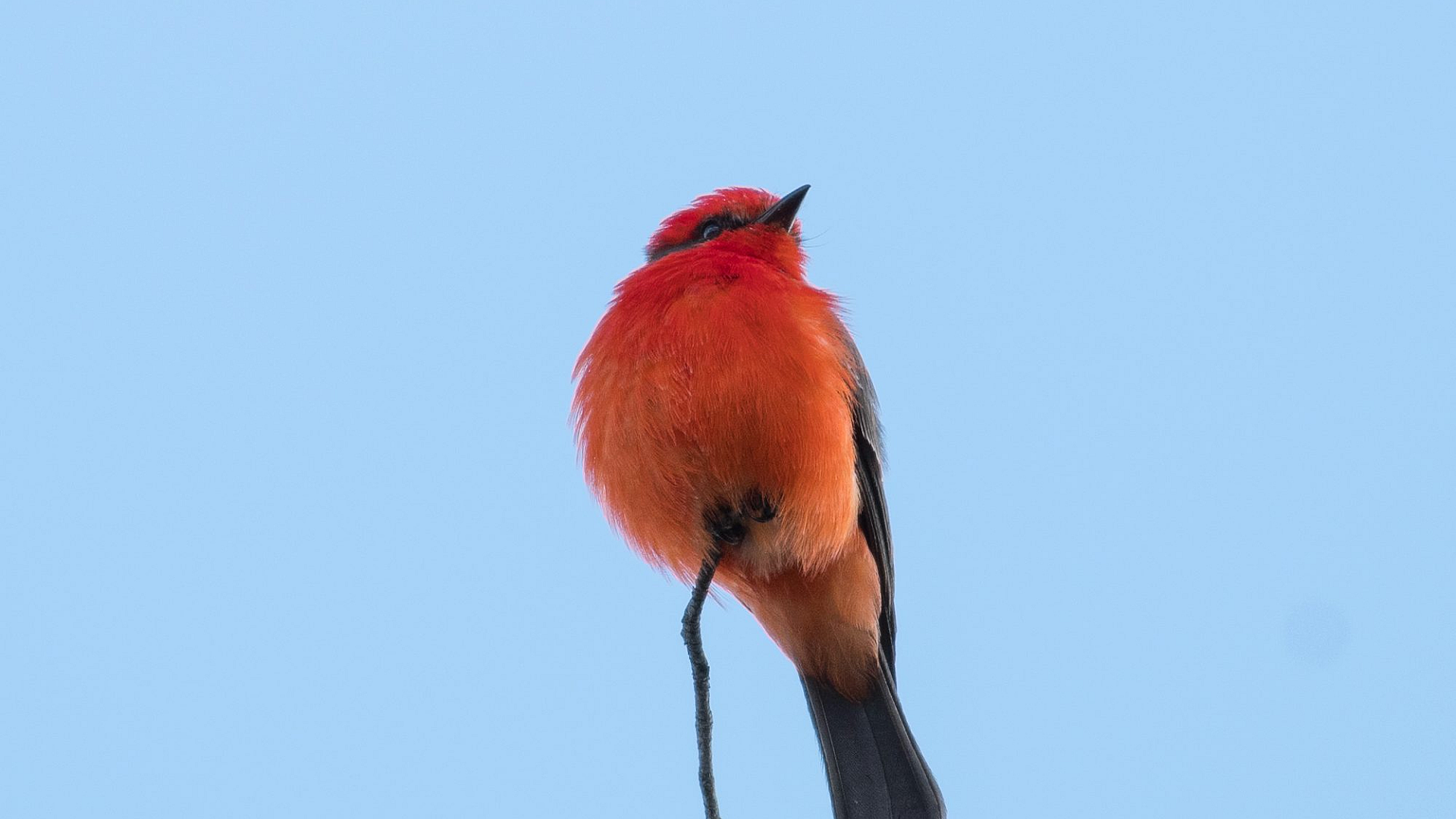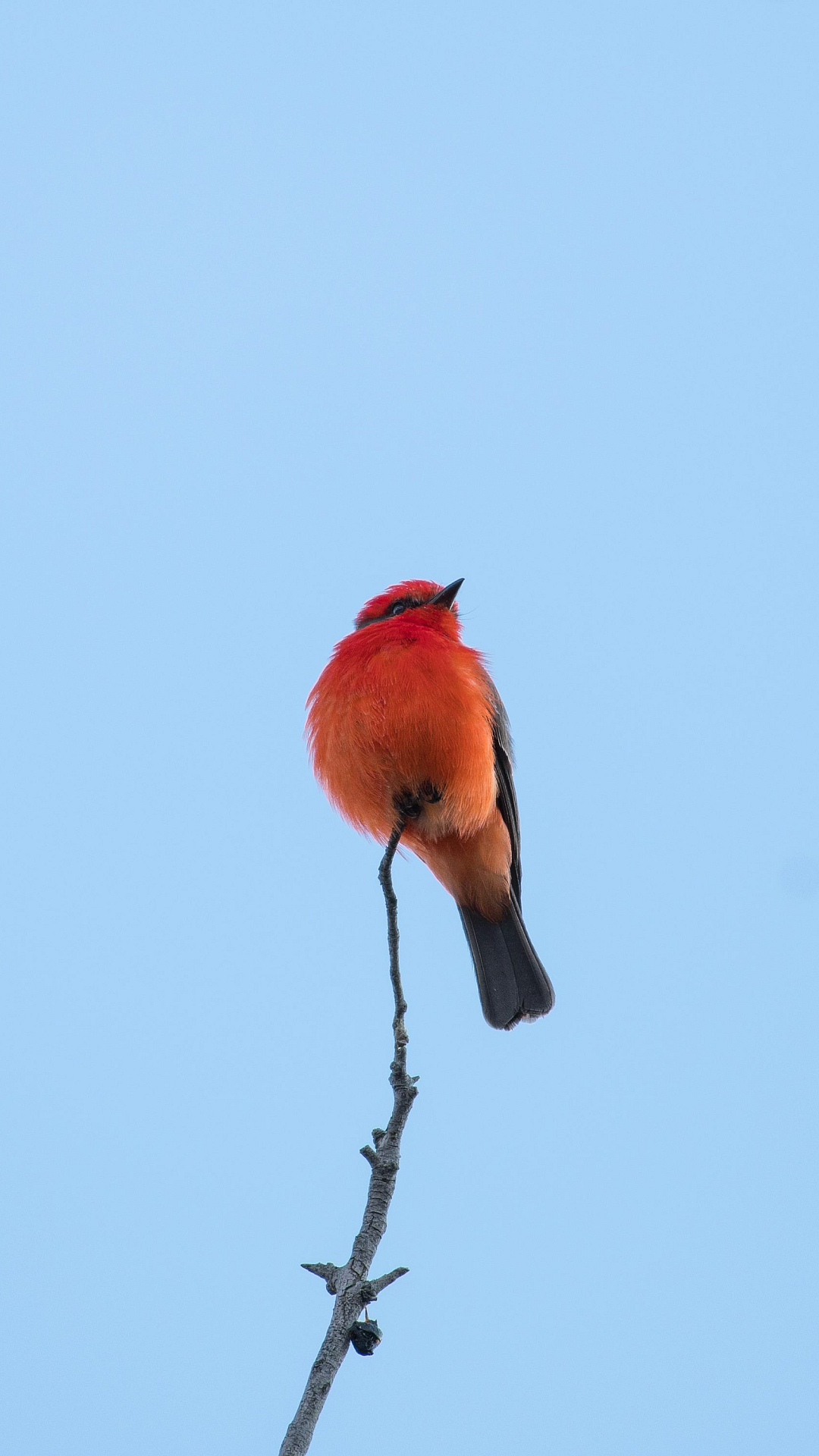 red bird, white sky, bird wallpaper, red bird wallpaper, sky wallpaper, avian wallpaper, nature wallpaper, animal wallpaper, wildlife wallpaper, feathered friend, scarlet bird, crimson bird, bright bird, clean sky, minimalist wallpaper