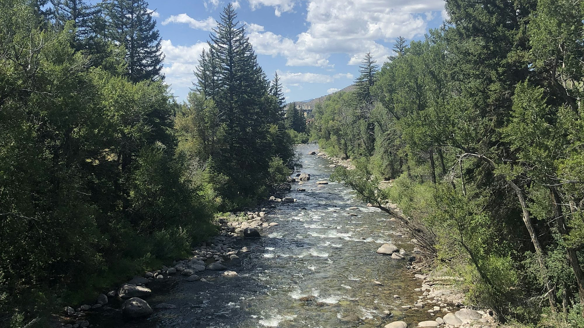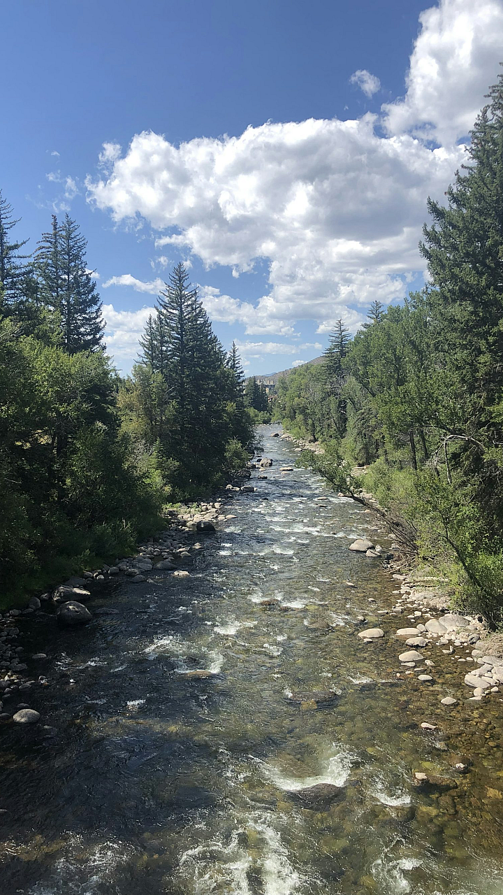 river, trees, green, blue sky, white clouds, nature, landscape, scenery, water, foliage, forest, woods, daytime, peaceful, serene