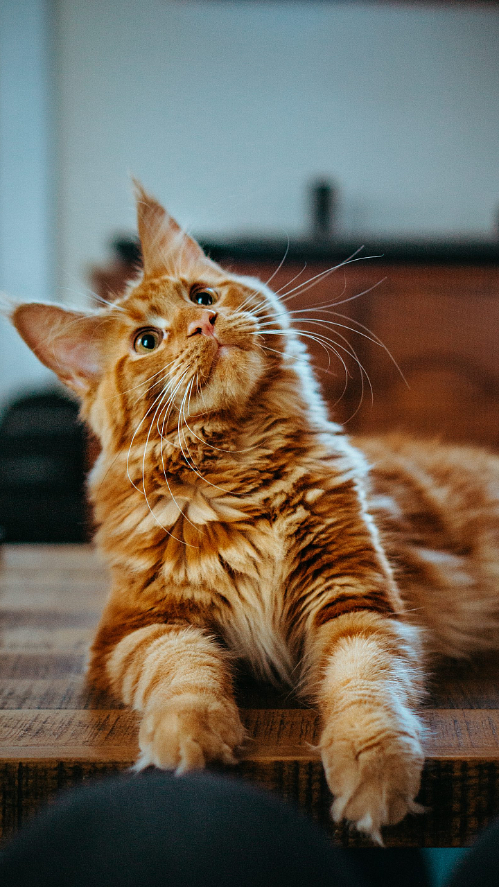 Keywords: orange cat, white cat, orange and white cat, cat wallpaper, feline wallpaper, pet wallpaper, animal wallpaper, selective focus, macro photography, close-up photography, brown table, tabletop photography, blurry background, cute cat, adorable cat